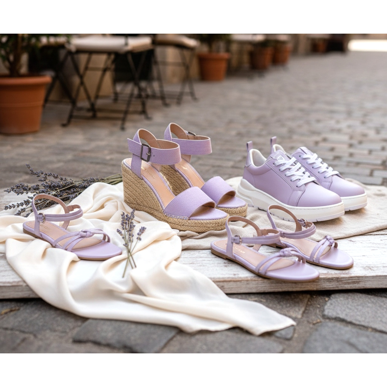 A levendula szandálok és espadrillák álmodozó nyári stílust teremtenek fehér és krémszínű anyagokkal kombinálva. A puha lila tornacipők azok számára, akik szeretnének kitűnni a tömegből.