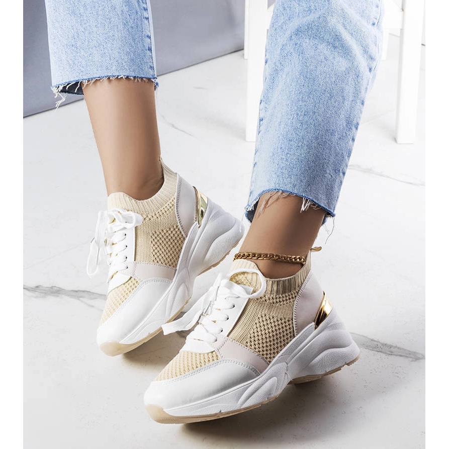 A modern cipők Ann kombinálják a sportos karaktert egy divatos ék vágással. A boka elõtt a rövid felső vége, és az elegáns öko -foltokkal rendelkező perforált textilanyagok könnyűséget és stílust adnak a cipõknek. A csúszásvágás csipkékkel befejeződött, amelyeknek köszönhetően megfelel a felsőnek a lábához. Egy vastag, fehér gumi talp (6 cm ékmagasság) divatos hornyokkal rendelkezik, amelyek hangsúlyozzák a modell városi esztétikáját.