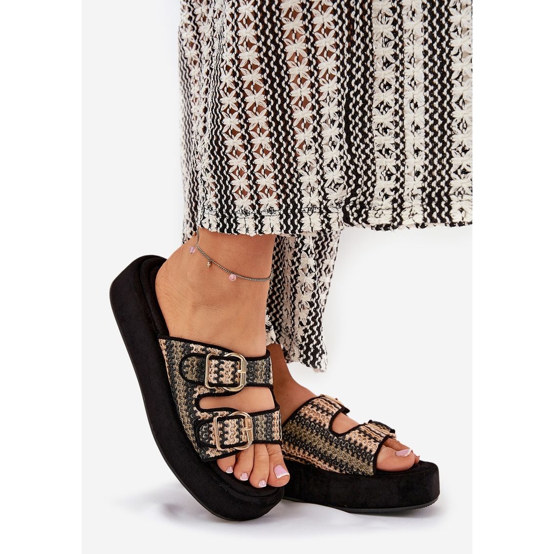 Részletek: A női papucs a platformon csatokkal és fekete zsinórral