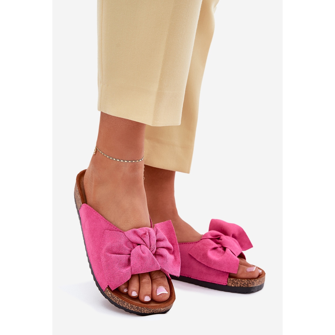 Részletek: A női papucs egy parafa talpon fukszia íjával rózsaszín