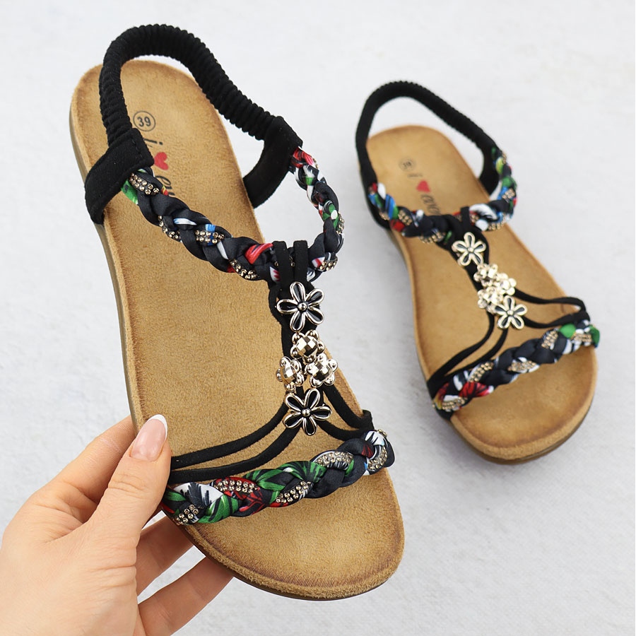 Az alacsony, lapos sarok, amelynek magassága 2,5 cm, és a talp vastagsága 1,5 cm, a szandált nemcsak kényelmessé, hanem stabilnak is. További előnye a finom strasszok, amelyek elegáns akcentust adnak a lábbelinek, tökéletes, mind napi, mind különleges alkalmakkor.