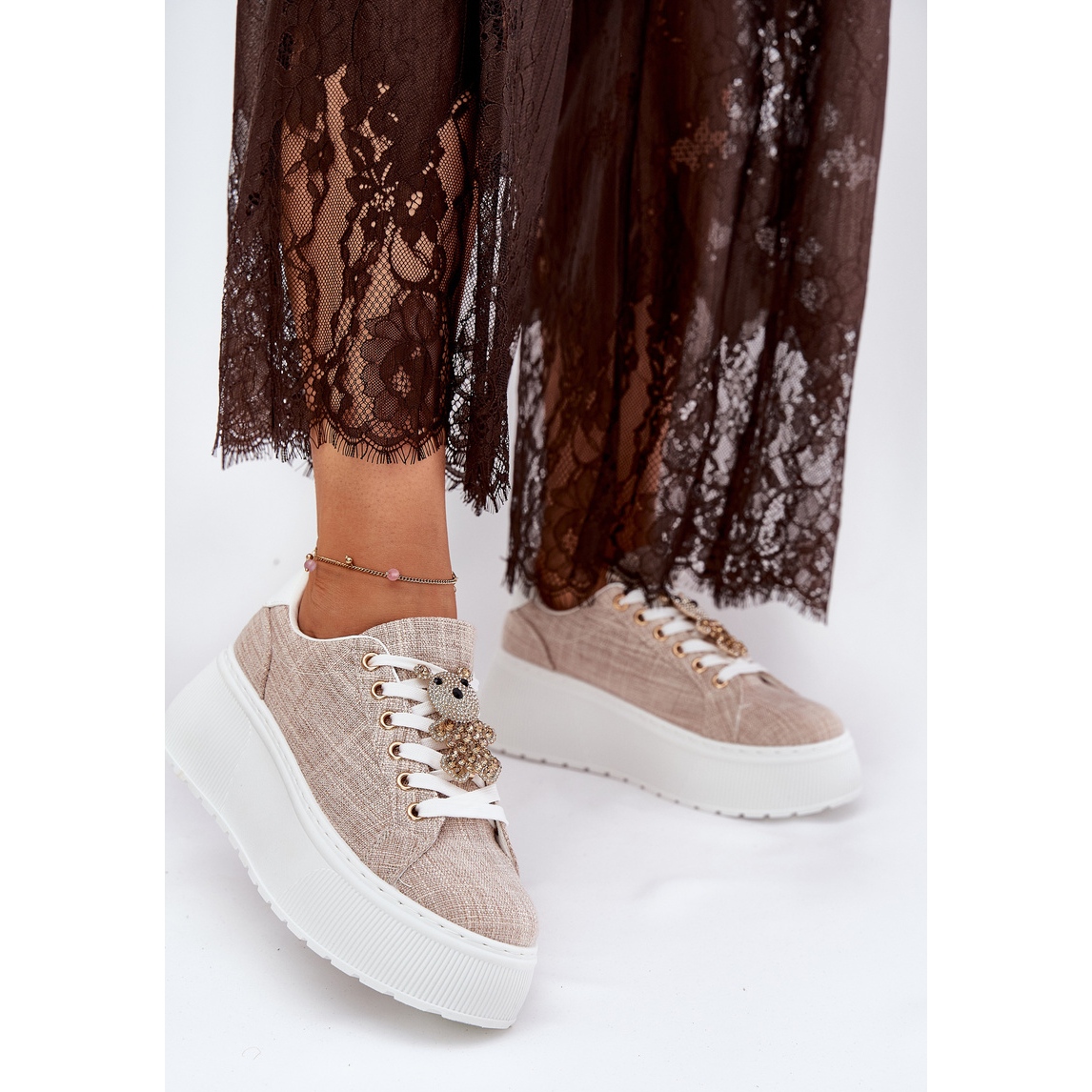 A platformon lévő cipők egy csapokkal Miś S. Barski BF51-014 Bézsben nagyszerű választás minden elegáns nő számára, aki mind a kényelmet, mind az eredeti formatervezést értékeli. Kiváló minőségű textil anyagból készült, ezeket az alacsony sportcipőket egy hatalmas, 5 cm -es magasságú platform jellemzi, ami nemcsak kényelmessé teszi őket, hanem hozzáadja a stilizálás könnyedségét és stílusát is.