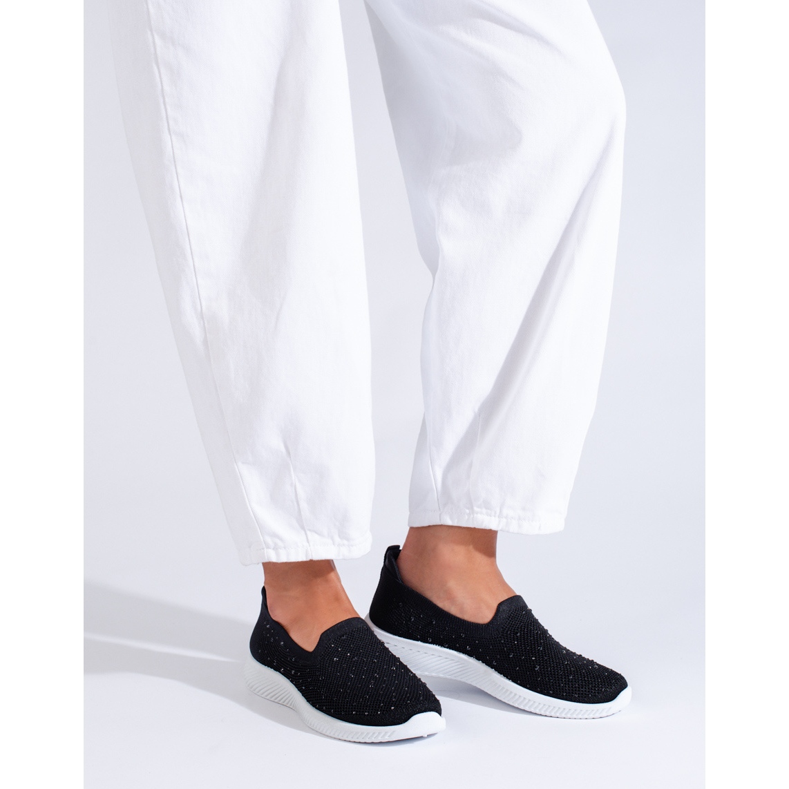 Ezek a híres Shelovet márka fekete szövet szegecsekkel ellátott cipői, amelyek tökéletesen illeszkednek a sportos és lezser stílushoz. A mindennapi használatra tökéletes divatos cipők kényelmet és mozgásszabadságot biztosítanak az épített, puha sarokpultnak és a rugalmas felső anyagnak köszönhetően, mely 100%-ban tartós textilanyagból készült.