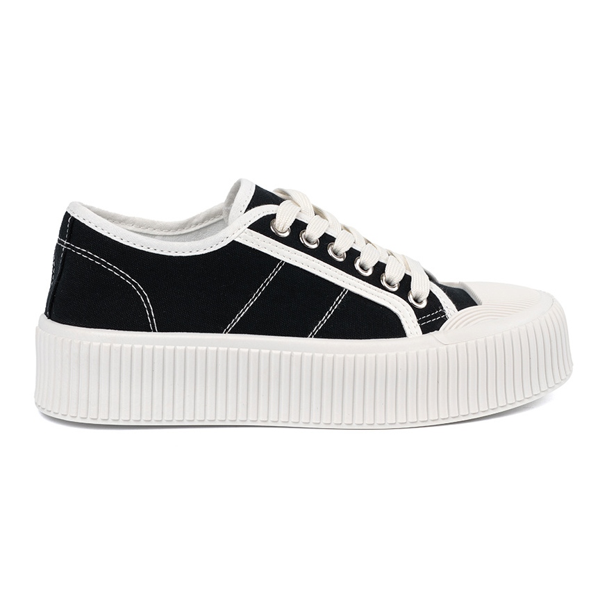A 4 cm -es magas platform néhány centiméter magas, és ugyanakkor stabil marad, ami lehetővé teszi, hogy szabadon mozogjon fáradtság nélkül. Az talp fehér színe szépen ellentétes az elegáns fekete -vel, ami miatt ezek a cipők jól keverednek mind a farmer, mind a ruhákkal.