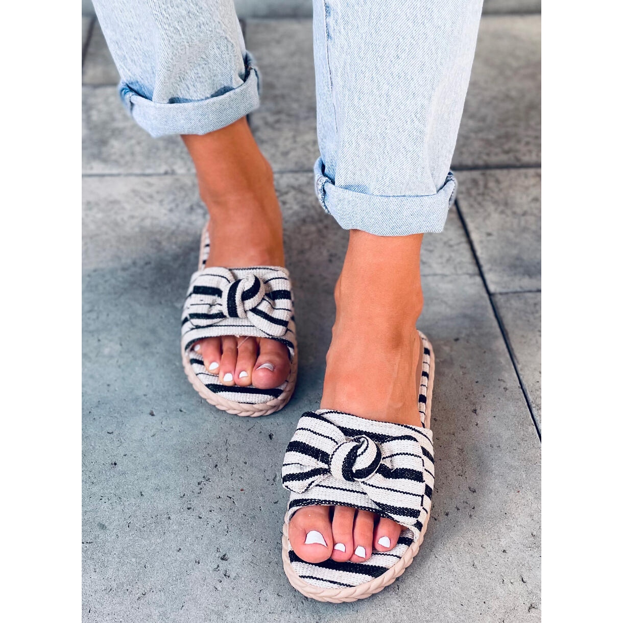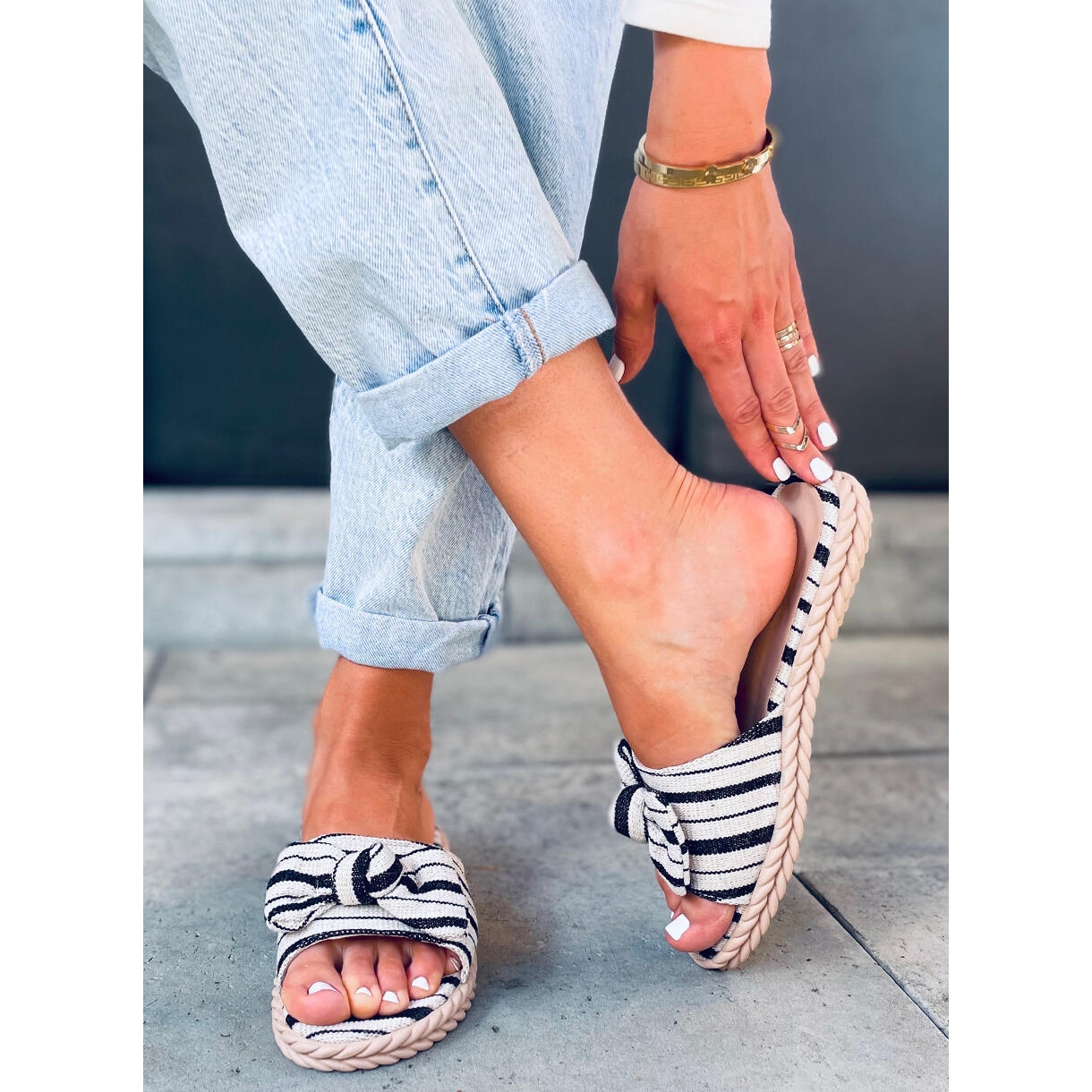 Bemutatjuk az Adana Black női papucsokat, amelyek tökéletesen kiegészítik nyári ruhatárát. Ezeket a stílusos, lapos talpú papucsokat elöl gyönyörű masni és nyári csíkos minta jellemzi, amely szemet gyönyörködtetővé teszi őket, és varázst ad minden stílushoz.
