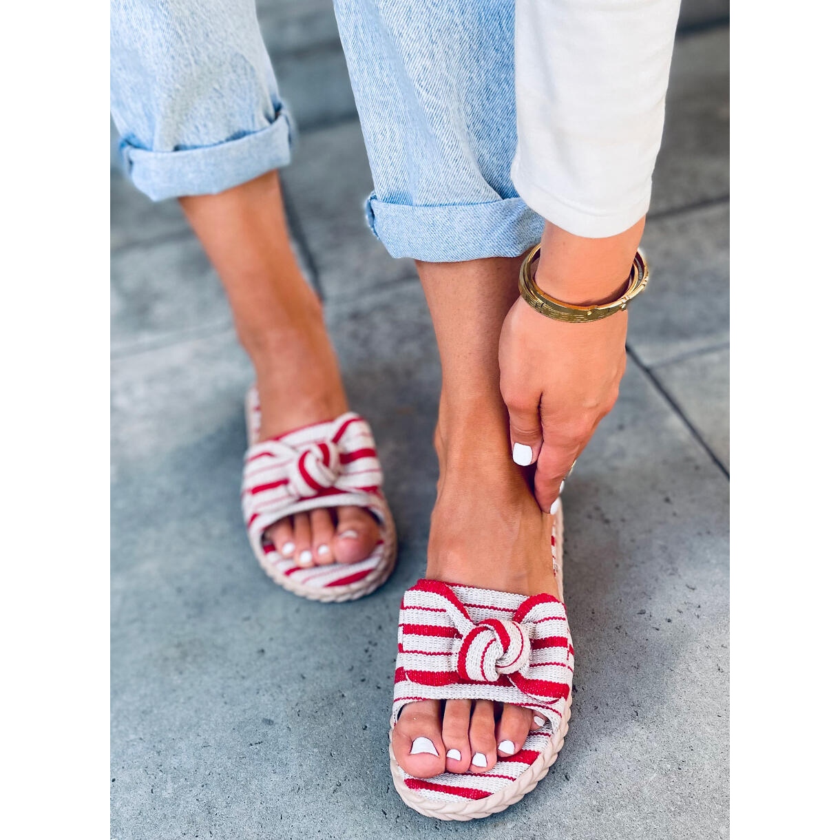 Az Adana Red női papucsok tökéletes választás a nyári napokra! Ezek a stílusos, lapos talpú papucsok a kényelmet és a divatos dizájnt ötvözik, rendkívül vonzó elemet alkotva bármilyen nyári stílusban. Az elején gyönyörű masni és a nyári csíkos minta vonzza a figyelmet, így minden egyes ruha egyedivé válik.