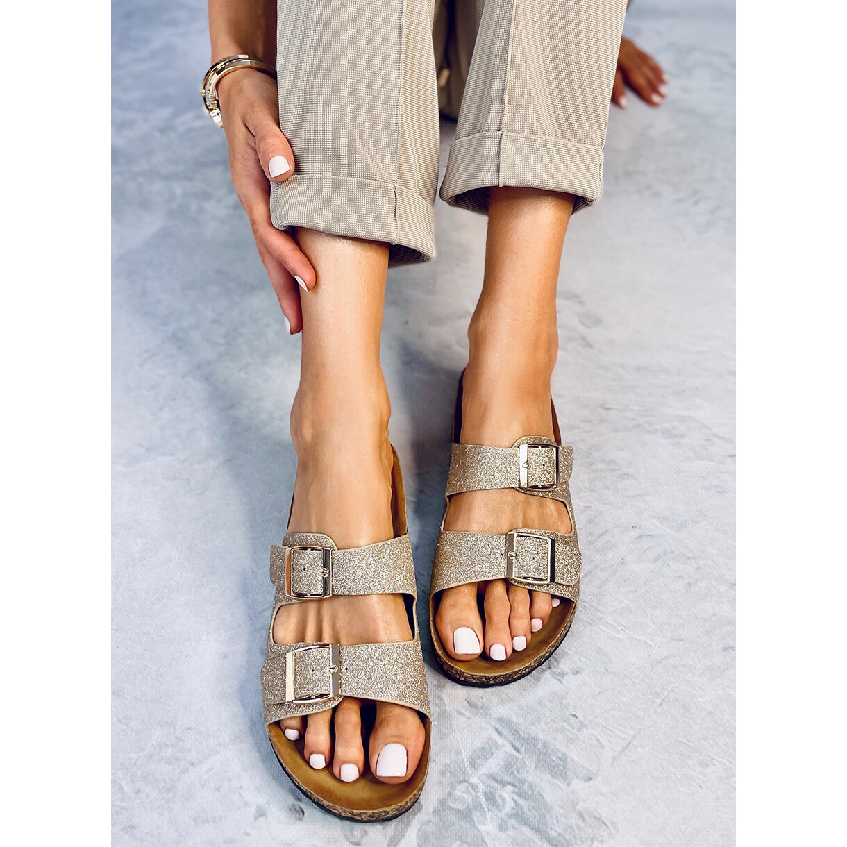 Figyelemre méltó a parafa talp, amely nemcsak környezetbarát, hanem mindenekelőtt kényelmes használatot biztosít. A profilozott belső betétnek köszönhetően minden lépés élvezetté válik – akár több óra elteltével is. A csillogó bevonat karaktert ad ezeknek a papucsoknak, az arany szín pedig klasszist.