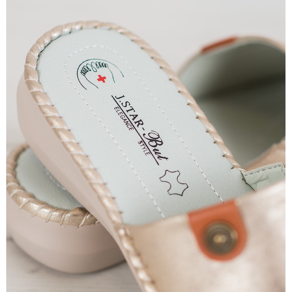 Fedezze fel az egyedi stílust és kényelmet a lezser J. Star ekobőrből készült, vakító arany színű papucsokkal. Ezek az elegáns papucsok tökéletes választás azoknak a nőknek, akik értékelik a magas minőséget és a divatos dizájnt. Hétköznapi stílusban tökéletesek lesznek tavaszi és nyári stílushoz.