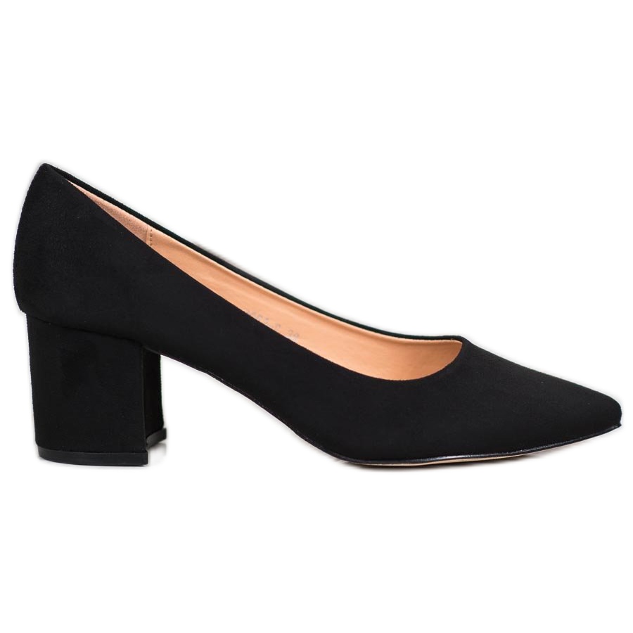 A pumpák stabil, 6 cm magas blokksarokkal rendelkeznek, ami rendkívül kényelmessé teszi őket, még hosszabb séta esetén is. Ezek a velúr bevonatú, ökobőrből készült cipők az eleganciát a környezetbarát megközelítéssel ötvözik. A hegyes lábujj modern karaktert kölcsönöz nekik, a bebújós zárás pedig rendkívül egyszerűvé teszi a fel- és levételüket.