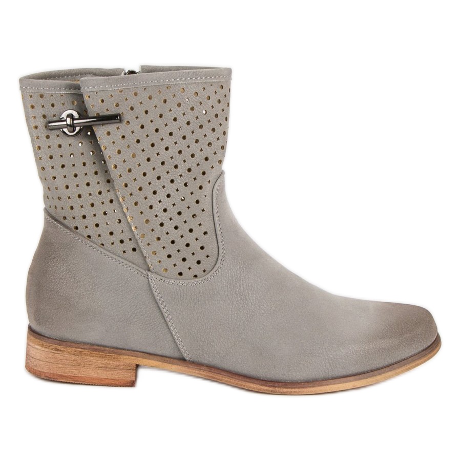 Ez a Filippo márka szürke, alkalmi női bokacsizmája, amely a divatos dizájnt és a viselési kényelmet ötvözi. Ezeket a stílusos csizmákat a magas felsőrész, gyönyörű áttört mintával jellemzi, amely elegáns és nőies karaktert kölcsönöz neki. A könnyű, fautánzó talp használata eredetiséget ad, és számos őszi és téli stílus tökéletes kiegészítőjévé teszi.