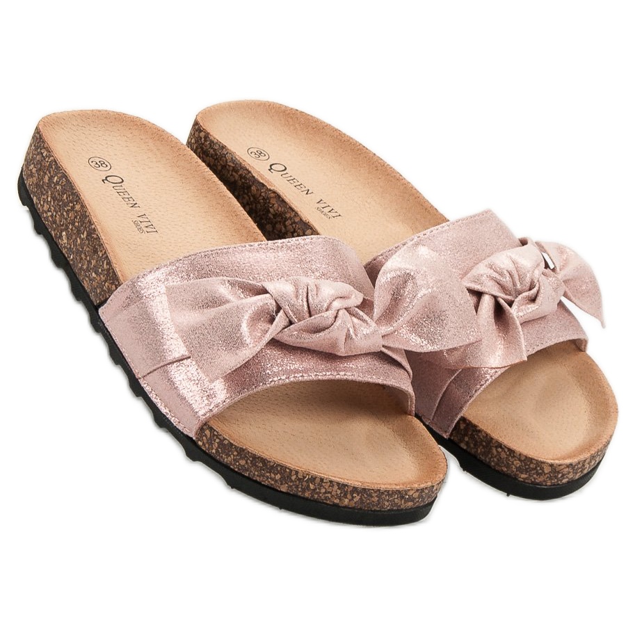 Ezeknek a papucsoknak jellegzetes eleme a lenyűgöző masni széles pánton, amely varázslatot kölcsönöz nekik, és egyedivé teszi őket az alkalmi stílusban. A finom rózsaszín színű csillogó minta vonzza a figyelmet, tökéletesen passzol a nyári ruhákhoz vagy rövidnadrágokhoz.