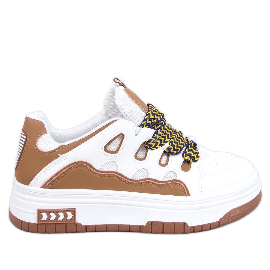 Ezeket a platformon található sportcipőket vonzó színek különböztetik meg - a klasszikus fehér, a barna akcentussal kombinálva rendkívül sokoldalúvá teszi őket, és könnyen alkalmazkodnak a különböző stílusokhoz. A széles, mintás csipkék megragadják a szemét, és hozzáadják az egész eredeti karaktert.
