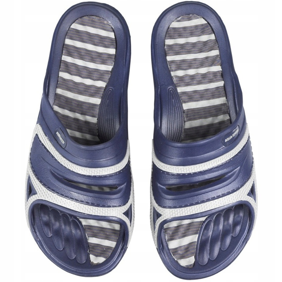 A gyakorlati és könnyű aqua-sebességű Tahiti úszómedence papucs kiváló választás a strand, az uszoda és a szauna számára. Eva habból és műanyagból készült, kényelmet, gyors szárítást és a láb stabil tartását biztosítják a széles szalagnak köszönhetően. A profilos betét és a nem -slip talp növeli a kényelmet és a biztonságot a nedves felületeken. A klasszikus sötétkék szín, szürke részletekkel sok stílusnak felel meg.