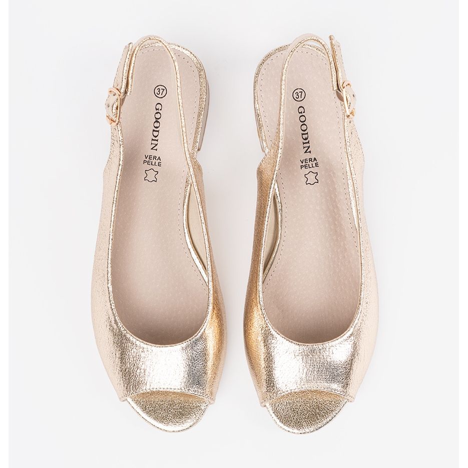 Az egyedi, alacsony, káposzta szandált bemutatjuk, elegáns arany színű a Goodin márkából. Ez egy nagyszerű választás minden olyan nő számára, aki a kényelmet és az eleganciát akarja kombinálni. Ezt a modellt egy nyitott sarok és ökológiai bőr jellemzi, ami nemcsak divatos, hanem barátságos környezet is.