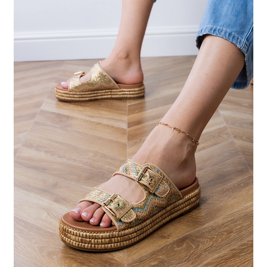 Kiváló minőségű műanyagból készült, nemcsak stílust, hanem tartósságot is kínálnak. A kerek orr egy 4 cm -es magas platformon kombinálva egész nap biztosítja a kényelmet, ami különösen fontos a forró napokon. Ezenkívül a barna műanyag talp nem csak divatosnak tűnik, hanem elbűvöli a gyakorlati képességét, a kopás ellenállását és a különféle felületek jó tartását is.