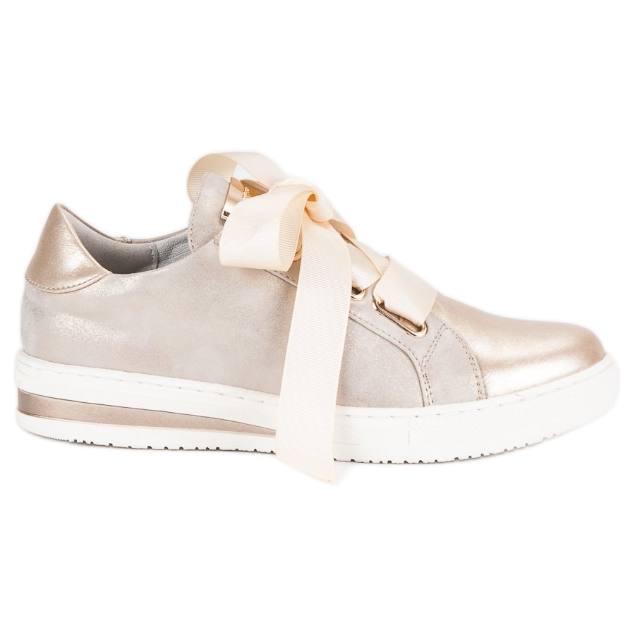 A kiváló minőségű ökológiai bőrből készült cipők finom arany színükkel gyönyörködtetnek, amely fényt ad és kitűnik a tömegből. A széles bézs szalagok fűzőként funkcionálnak, szokatlan, de nagyon elegáns részletet alkotva. Ezenkívül a sarokpultjuk merevített, ami kiváló tartást biztosít a lábnak, a kerek orr pedig kiemeli a lábbeli klasszikus karakterét.