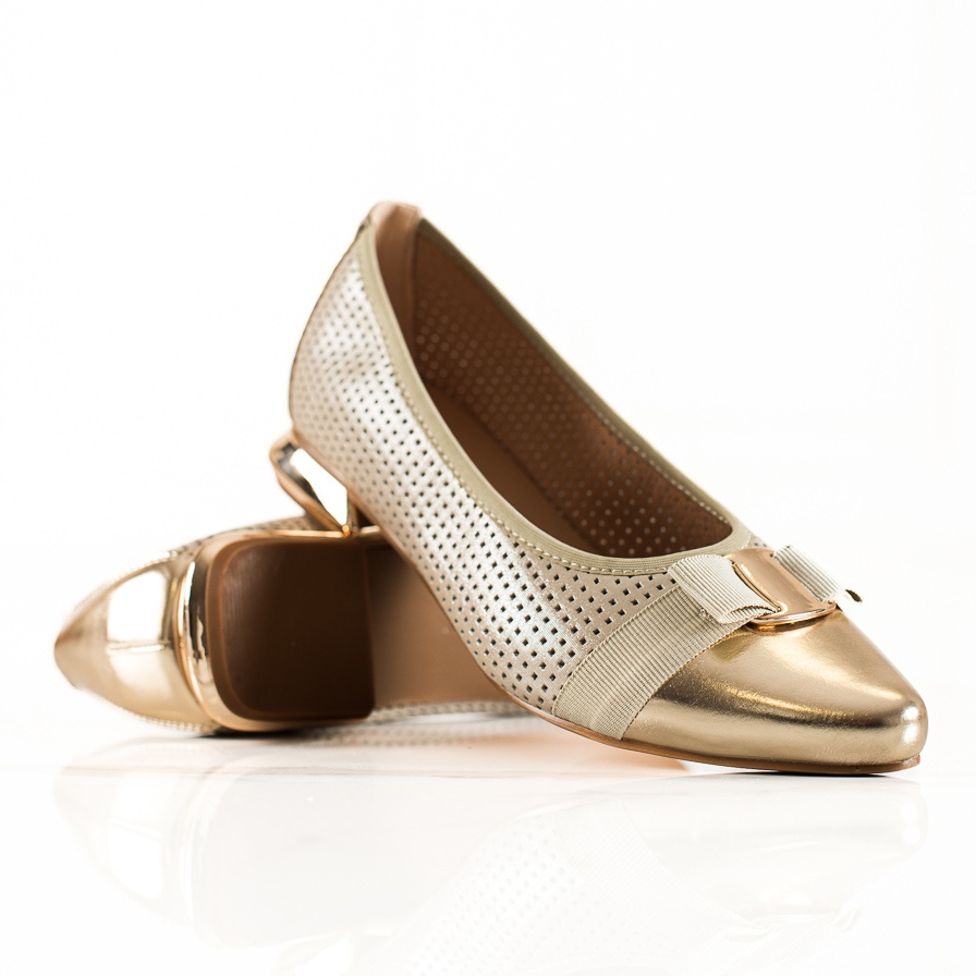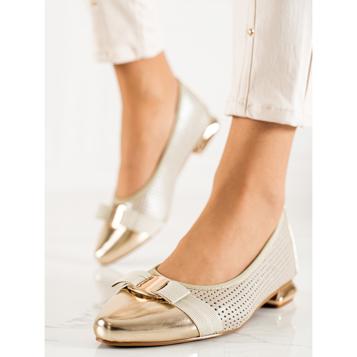 Fedezze fel az eleganciát és a kényelmet az arany W. Potocki szivattyúkkal! Ezek az egyedi női cipők a lezser stílust elegáns akcentussal ötvözik, így ünnepekre és hétköznapokra egyaránt tökéletesek. Sima, szintetikus talpuk biztosítja a láb kényelmét, a beépített, puha sarok pedig stabilitást garantál viselés közben.