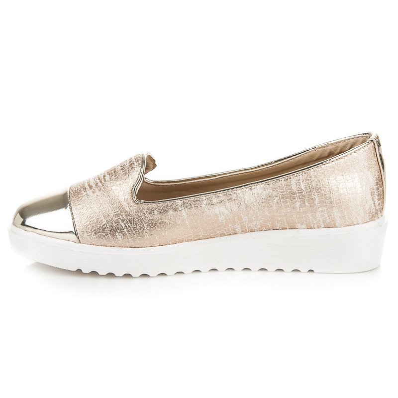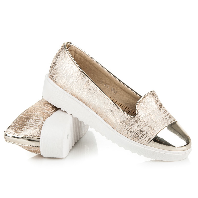 Arany színük egyedi karaktert kölcsönöz nekik, tökéletesen kiegészítve mind a hétköznapi, mind az esti stílust. Ezenkívül a kerek orr és a 3 cm magas platform garantálja az egész napos viselési kényelmet. A bebújós zárás rendkívül egyszerűvé teszi a cipők fel- és levételét.