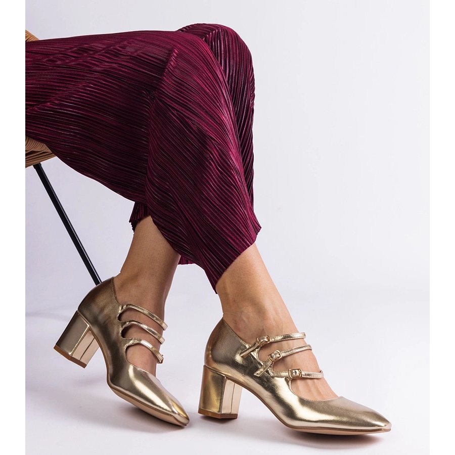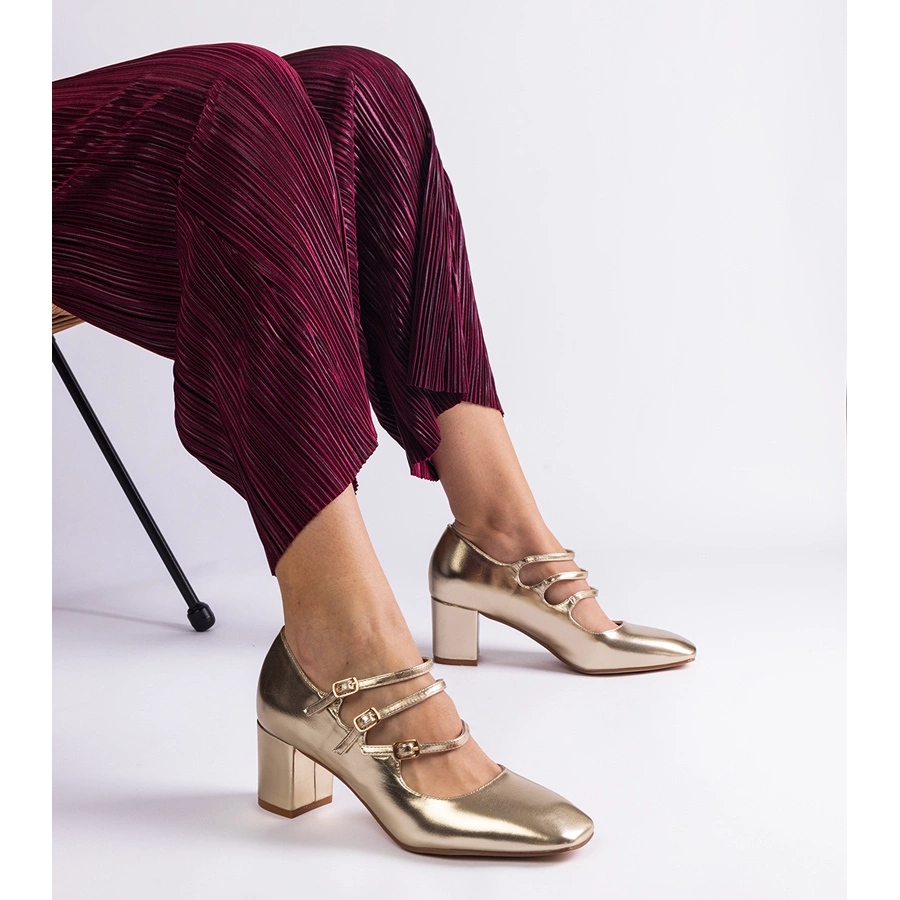 Az aranyszivattyúk egy dekoratív csatokkal rendelkező oszlopon ideális javaslat azoknak a nőknek, akik a divatot és a kényelmet akarják kombinálni. Ezeket az elegáns cipőt nemcsak egy gyönyörű aranyszín, hanem a modern kialakítás is megkülönbözteti, a négyzet alakú NOSC és a fémes kivitelnek köszönhetően. A magas minőségű bio bőr a szivattyúkat nemcsak tartós, hanem kellemes viselet is.