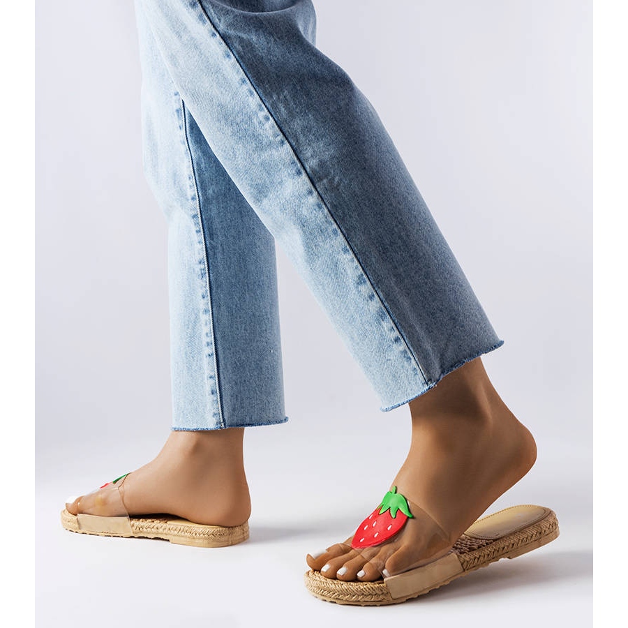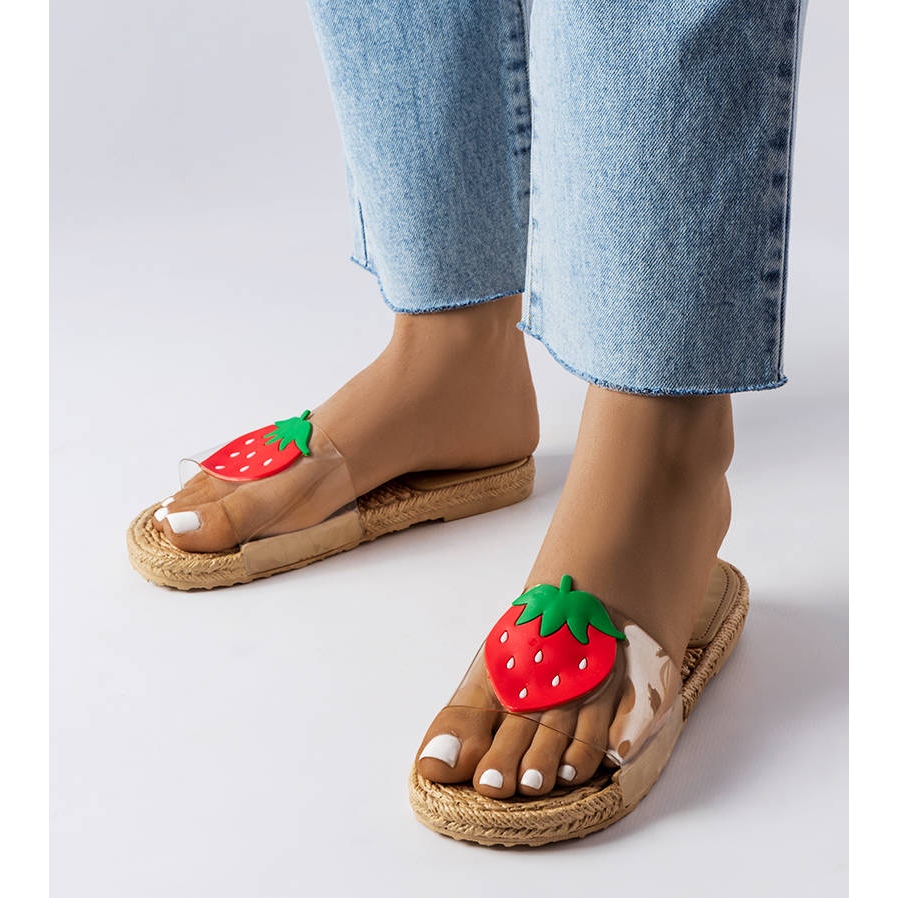Ezeknek a papucsoknak a megkülönböztető jellemzője a bájos eper formájú, finom díszítés, amely karaktert kölcsönöz nekik, és minden lépést divatos akcentussá tesz. A papucsok a nyári hangulatot hangsúlyozzák, a színtelen átlátszóságot energikus vörös akcentussal kombinálják.