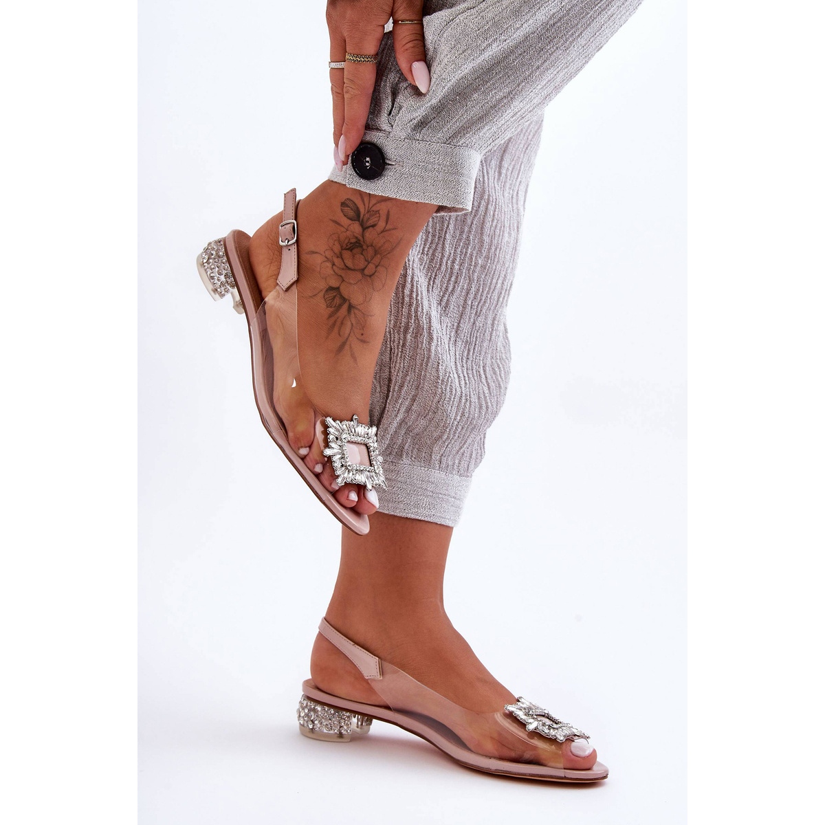 Elegáns, nőies szandál, amely könnyedséget eredményez a stilizációhoz. Az átlátszó felső, az ékszer -dekoráció elülső részén és az ezüst elemekkel kombinálva finom, divatos hatást eredményez. Állítsa be egy lapos, 3 cm -es sarkú, csapokkal díszítve - tökéletes tavasszal és nyáron, amikor a kényelem és az elegancia kombinációját keresi.