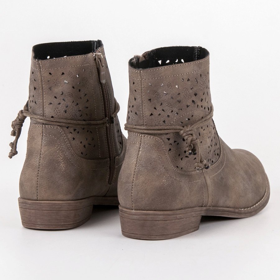 E csizmák jellegzetes eleme az áttört felsőrész, amely könnyedséget és eredetiséget ad. A boka körüli zsinór lehetővé teszi a lábbeli egyéni igényeihez igazítását, míg a bal oldalon található cipzár megkönnyíti a fel- és levételt. A csizmák alacsony, lapos sarokkal vannak felszerelve, 3 cm magas, ami nagyon kényelmes viseletet biztosít, tökéletes mindennapi használatra.