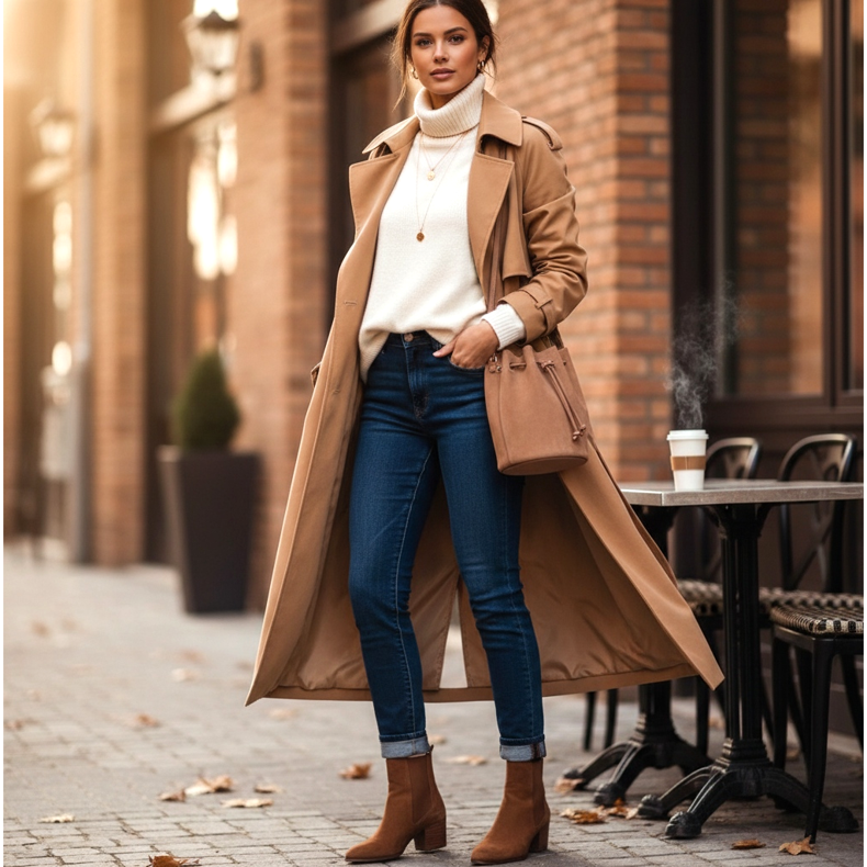A barna Chelsea csizma sötét karcsú farmerrel és egy puha bézs vagy krémszínű pulóverrel kombinálva a könnyed nőies elegancia esszenciája. A bokánál enyhén felhajtott farmerek szabaddá teszik a cipőt, és levegőt adnak a stílusnak.
