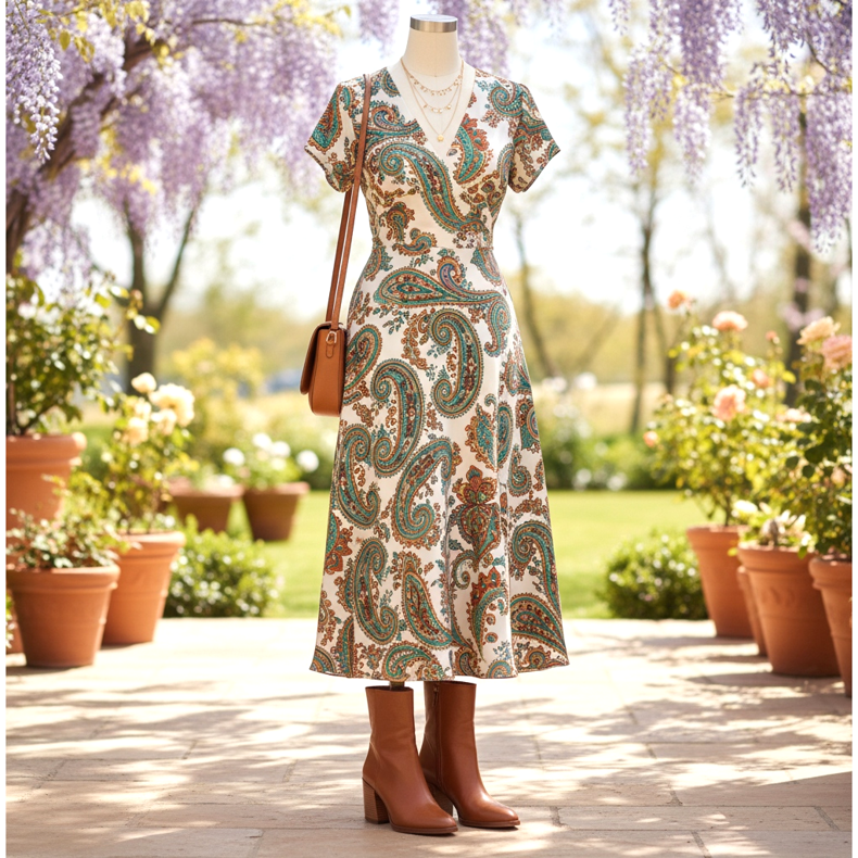 A viszkózból vagy selyemből készült, paisley- vagy virágmintás midiruha barna magas sarkú bokacsizmával kombinálva tökéletes megjelenés egy tavaszi esküvőre vagy egy szeretett személy születésnapjára. Adjon hozzá egy barna bőr válltáskát és egy finom nyakláncot - a hatás kész.