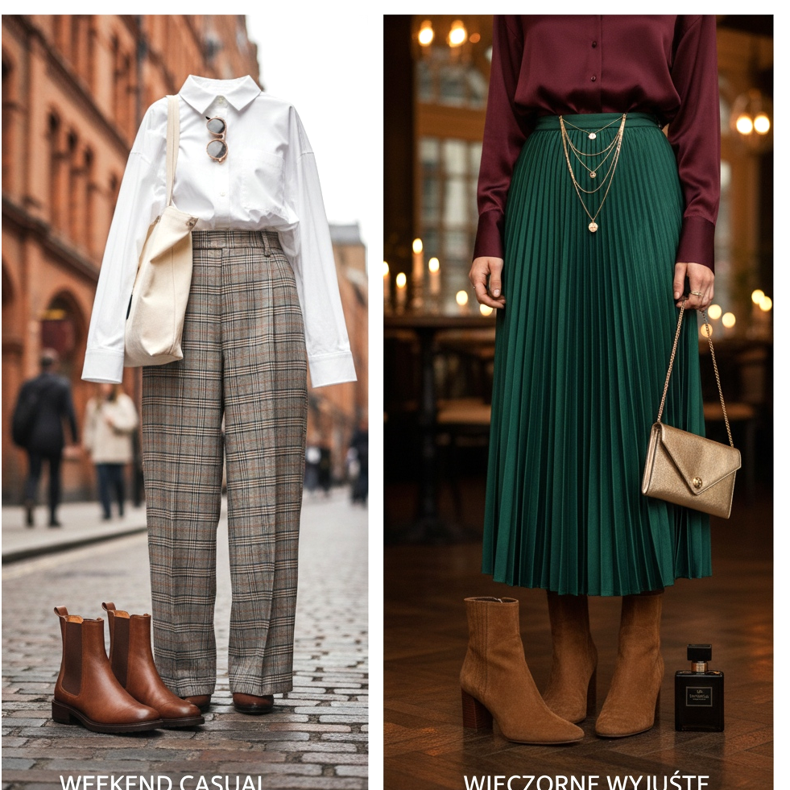 Alkalmi hétvége: Széles, kockás nadrág (ún. kockás nadrág) fehér pólóval vagy egyszerű oxford inggel és barna Chelsea csizmával kombinálva – ez a London divatos utcái által ihletett megjelenés, amely egyformán jól használható hétvégi bevásárláshoz és egy kávézóba a barátokkal. Egy hosszú bőrtáska vagy egy vászontáska tökéletes kiegészítő.