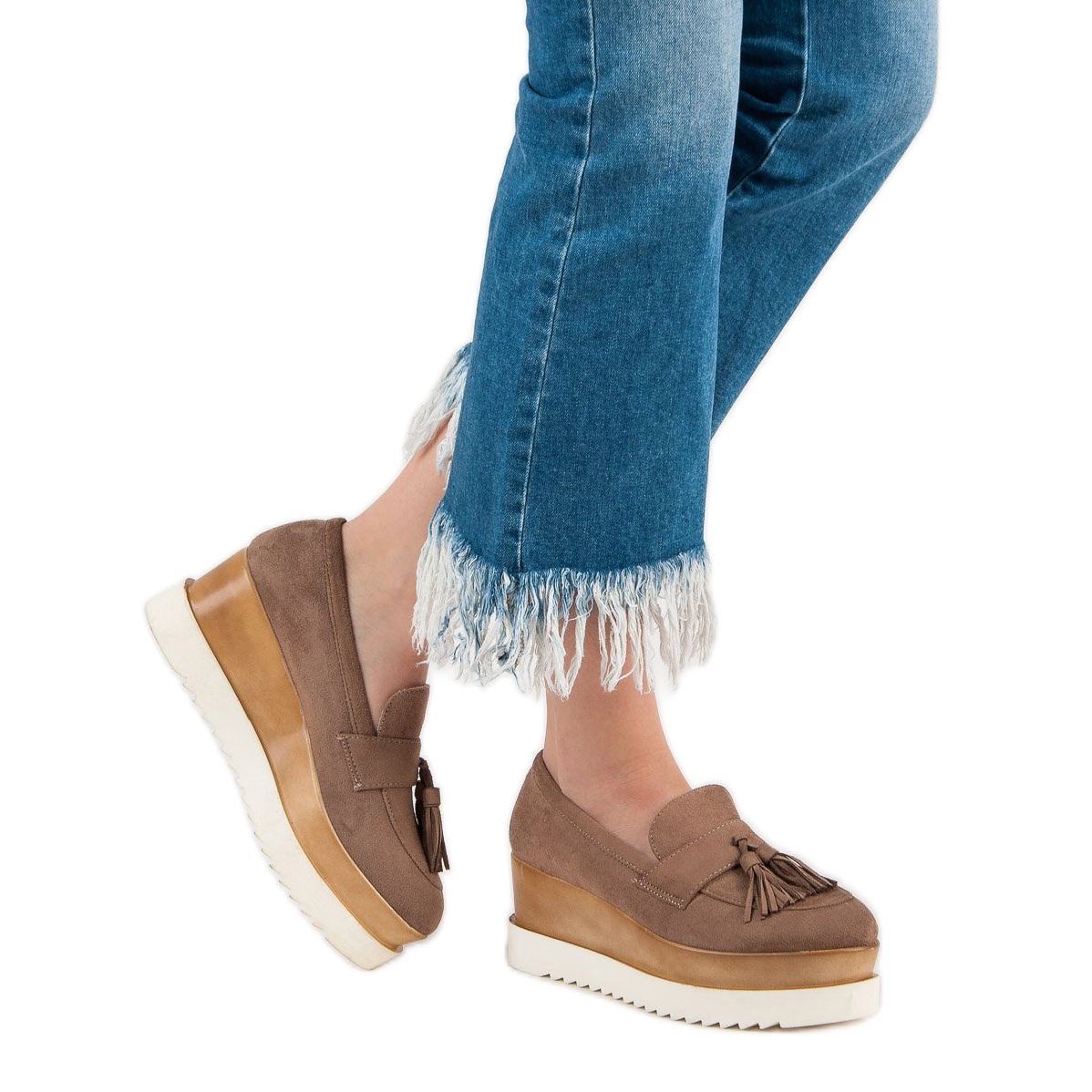 A mokaszinokat az eredeti, kényelmes felsőrész és a kiépített, merevített sarok jellemzi, amely minden lépésnél stabilitást garantál. A 7 cm-es sarokmagasságnak köszönhetően ezek a cipők némi magasságot adnak, miközben kényelmes használatot biztosítanak. A kerek lábujj kényelmesen érzi a lábát, a rojtok pedig egyedi karaktert adnak, ami felkelti a figyelmet.