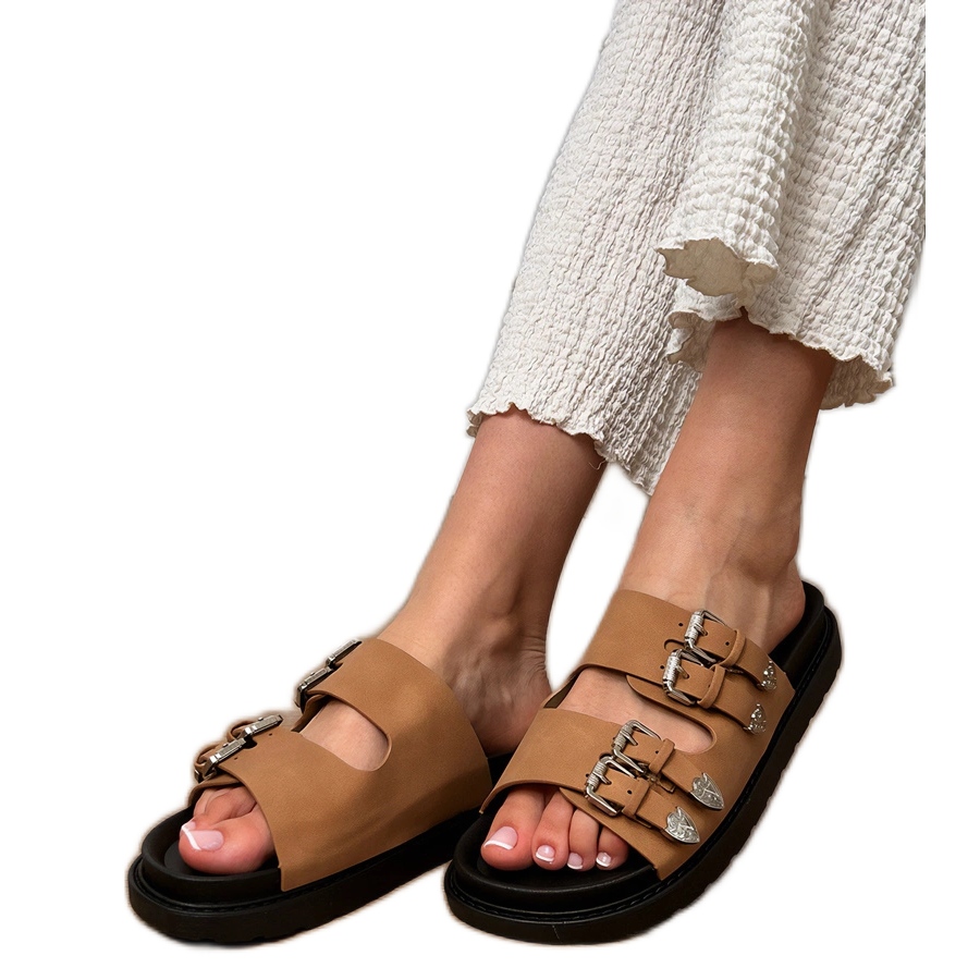 Részletek: Barna női papucs dekoratív csatokkal bézs