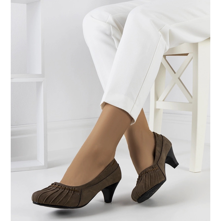 A klasszikus, beépített Santro szivattyúk khaki univerzális árnyalatában kötelező egy nő ruhásszekrényében, aki időtlen stílust értékel. Ökológiai bőrből készült, gyengéd ráncos felsőkkel, a lekerekített szerszámnak köszönhetően finoman vékony a lábuk. Az alacsony, 4,5 cm magasságú, a nap folyamán stabilitást és kényelmet nyújt, ezért a modell nagyszerű az irodában és a hivatalos ülések során.