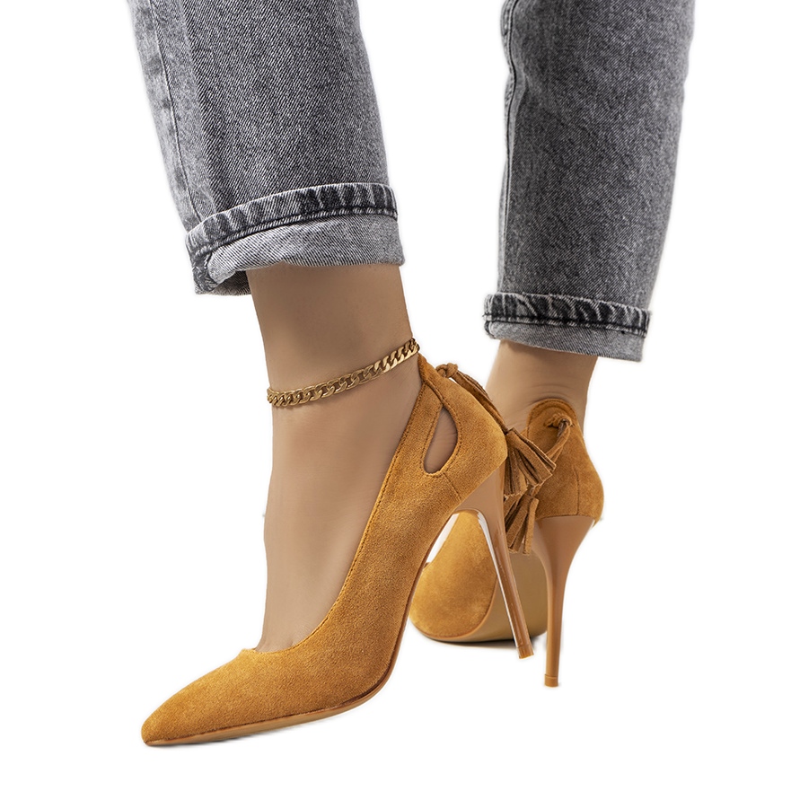 További előnyök a felsőrész hátulján található finom kivágások, amelyek könnyedséget adnak a cipőknek, valamint a stílusos pánt, amely kiemeli divatos karakterét. A barna teve szín a bézs talppal kombinálva teszi ezeket a pumpákat számos stílus tökéletes kiegészítőjévé.
