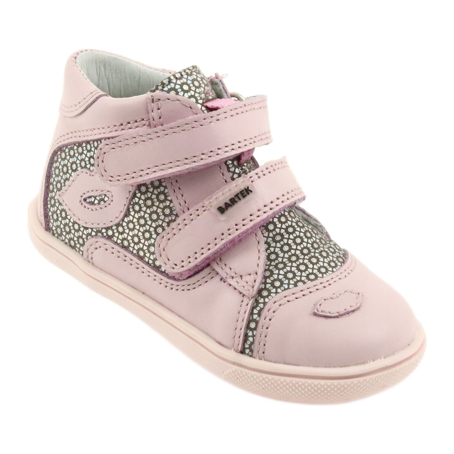 Elegáns és funkcionális Bartek 11703 cipő, amely teljesen természetes bőrből készült. A finom ezüst díszítésű, visszafogott rózsaszínű színeknek köszönhetően a cipők nagyszerűek lesznek a kis Modnisi mindennapi stílusában. Tökéletes a tavaszhoz és az őszhez.