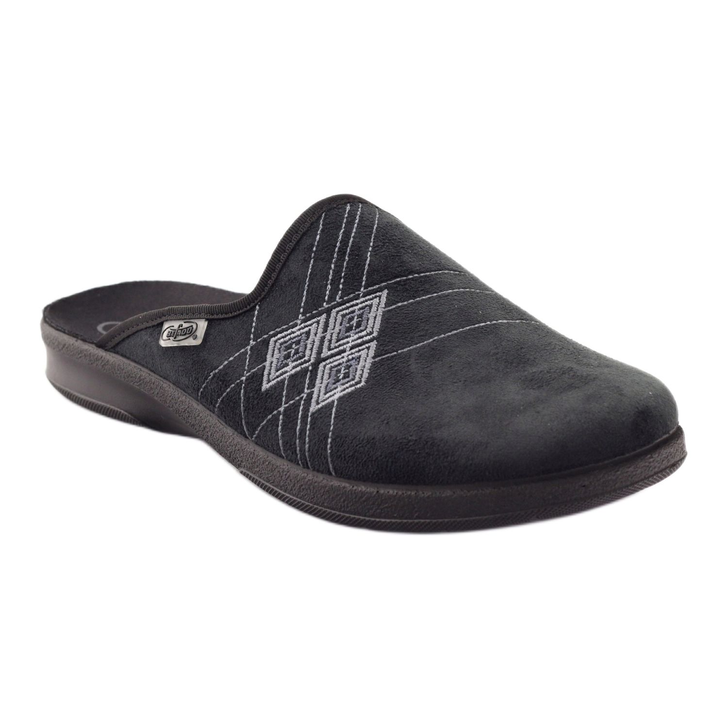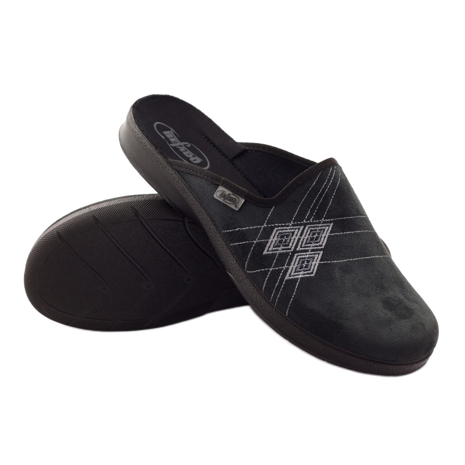 Az anatómiailag profilozott és rugalmas talpnak köszönhetően a Befado papucsok tökéletesen elnyelik a mikrosokkokat, kivételes kényelmet biztosítva használat közben. A külső anyag velúr ökológiai bőr, gyönyörű sötétszürke (Dk.grey) árnyalatban, amely divatos és elegáns megjelenést kölcsönöz a lábbelinek. A papucs belseje strapabíró szövettel van bélelve, a bebújós kialakítás pedig gyors és egyszerűvé teszi a cipők fel- és levételét.