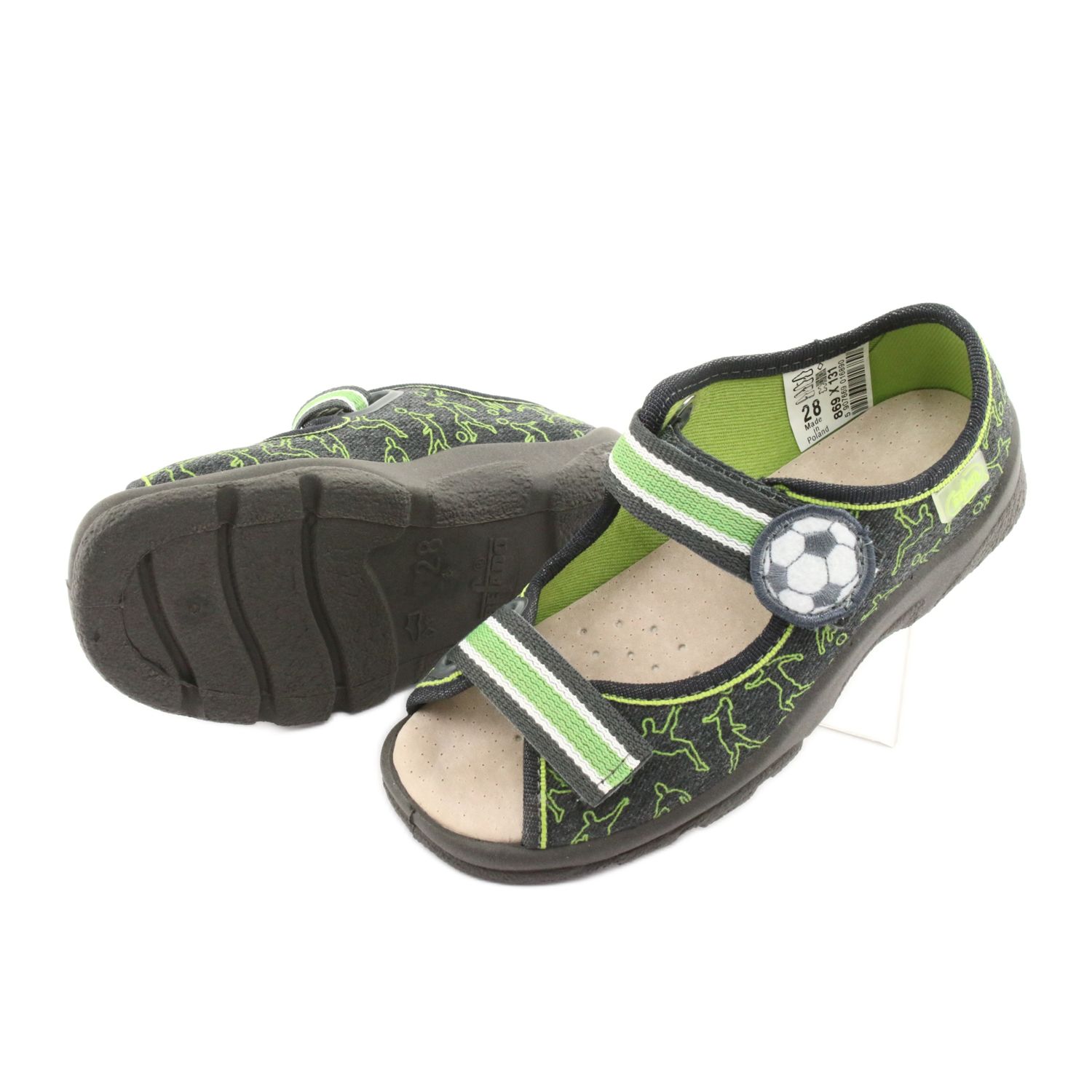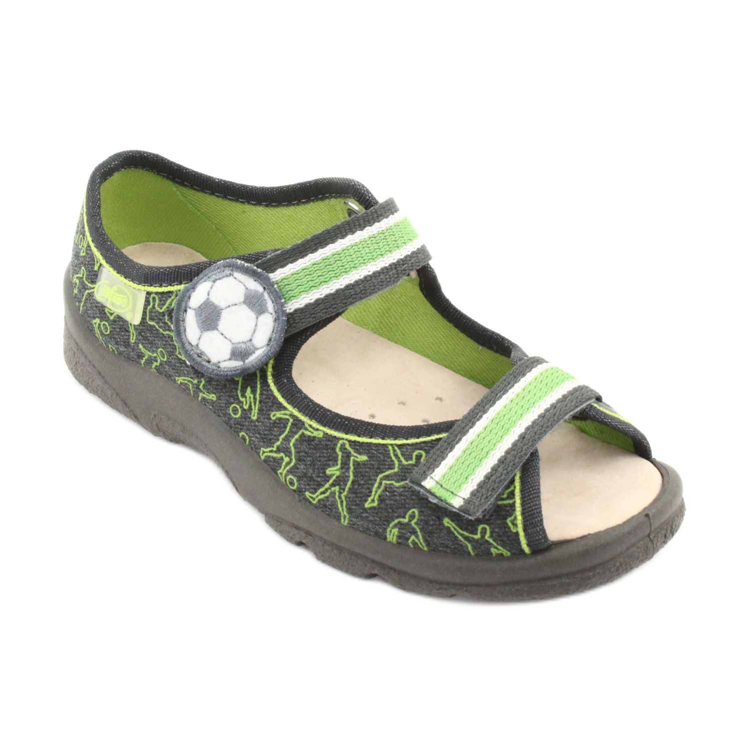 Egyedi befado 869x131 méretű, szürke és zöld színű gyerekcipőt kínálunk Önnek, amely minden gyermek számára kényelmesen és kényelmesen fogja érezni magát az óvodai játék során. Ezeket a funkcionális szandálokat gondosan a legkisebbek igényeit szem előtt tartva tervezték, megemelt sarokkal és stabil oldalakkal, amelyek garantálják a helyes lábtartást viselés közben.