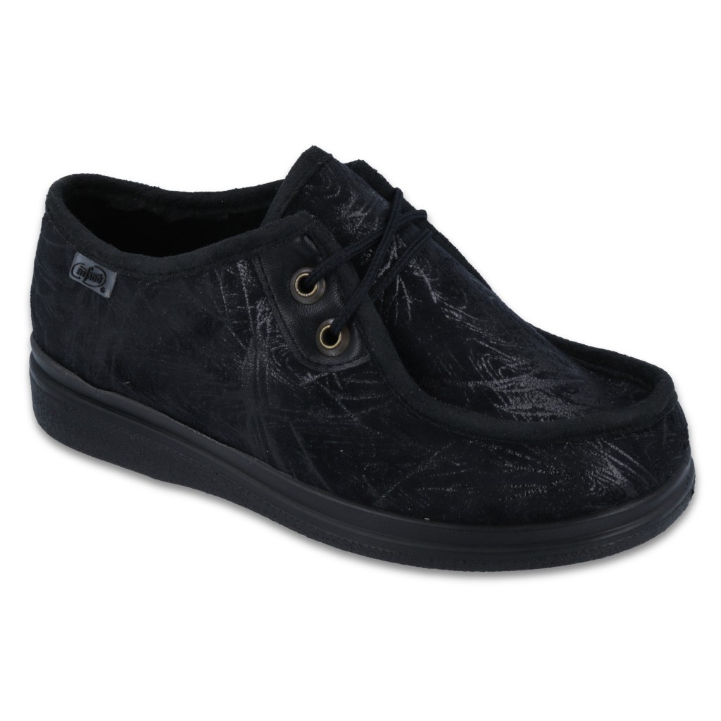 A Befado papucsok fűzőkkel vannak rögzítve, így könnyen a lábhoz igazíthatók. A kerek orr és az alacsony talpmagasság (2,5 cm) biztosítja a stabilitást és a járási kényelmet, a szintetikus talp pedig beltéri és kültéri használatra egyaránt alkalmassá teszi a lábbelit. A fekete szín finom, domináns mintájával eleganciájukkal és stílusos megjelenésükkel kiemeli ezeket a papucsokat.
