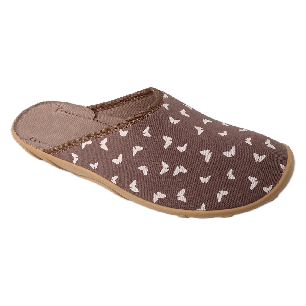 Női papucsok Befado 235D194 barna színű, pillangómotívummal díszítve, tökéletes választás azok számára, akik a mindennapi otthoni cipőben értékelik a kényelmet és a stílust. A szellős textil anyagokból készültek, ezek a papucsok egész nap biztosítják a kényelmet.