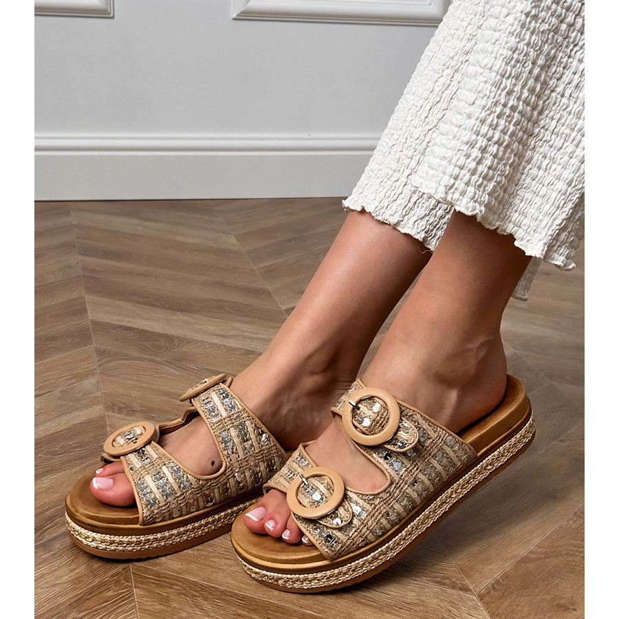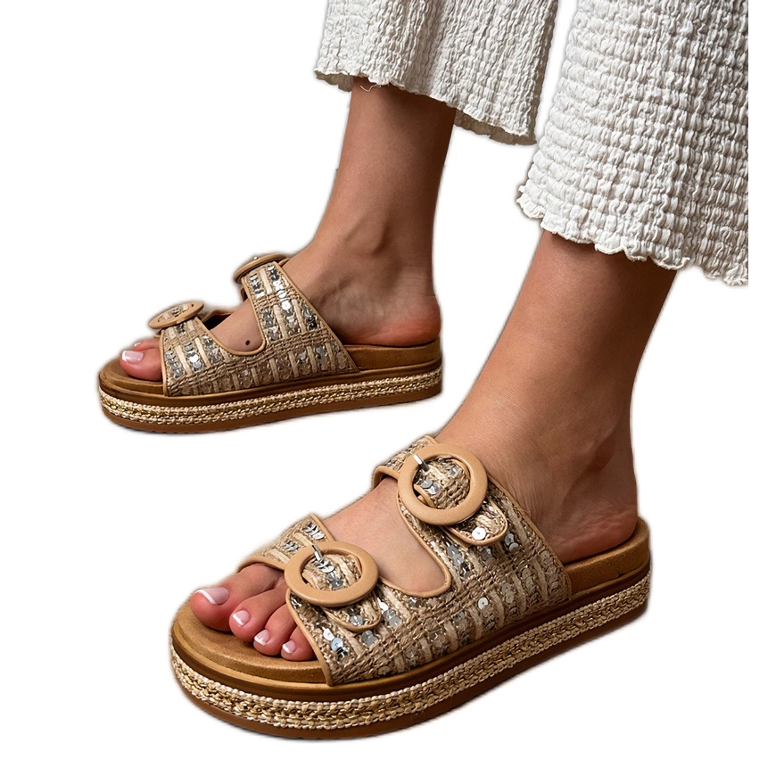 Egyetemes bézsük, egy barna talp kombinálva, tökéletesen keverednek a különféle stilizációkkal - a könnyű ruháktól a divatos rövidnadrágokig. A kerek lábujj és a 4,5 cm -es magas platform garantálja az egész nap viselésének kényelmét, és a flitterrel díszített fonott csíkok egyedi karaktert és ragyogást adnak nekik.