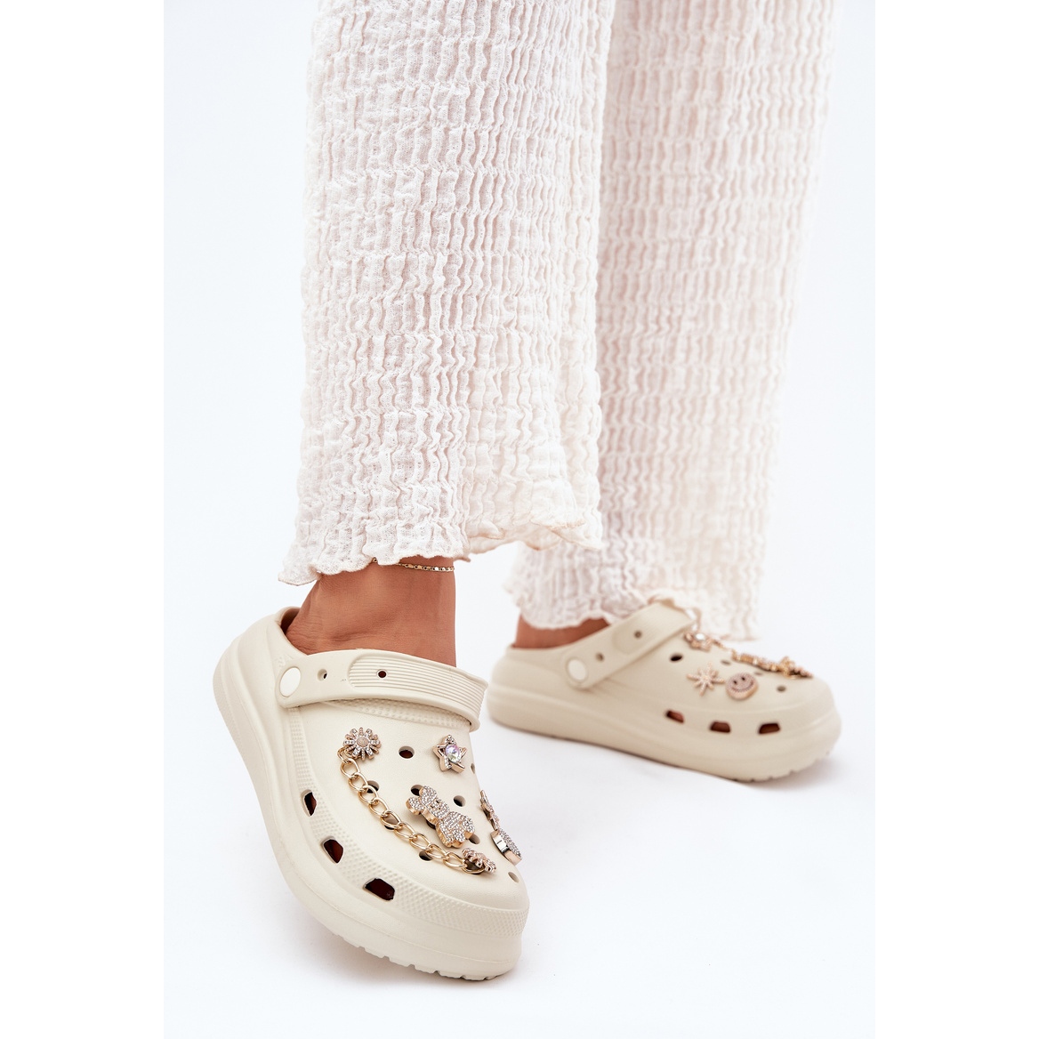 Fedezze fel az egyedi kényelmet és a divatos stílust, ha hab női szárnyakkal bézs csapokkal! Ezek a papucsok, amelyek kiváló minőségű habműtből készültek, ideális társok meleg napokra. A vastag, stabil 3 cm magasságú talp kényelmet nyújt a viseléskor, és a fedett orr hozzáadja az eleganciát.