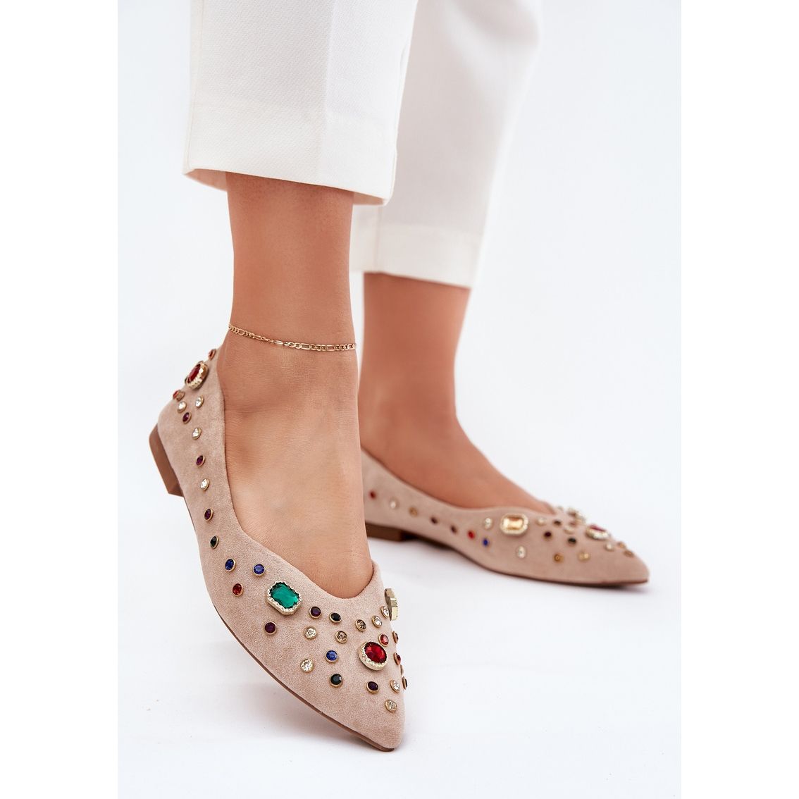 Fedezze fel az eleganciát és a kényelmet, köszönhetően a kristályokkal díszített bézs női balerináknak. Eco velúrból készültek, ezek az elegáns cipők nemcsak a szemét, hanem minden alkalommal biztosítják a kényelmet. A Spitz orra optikailag meghosszabbítja a lábakat, hozzáadva a stílust és a karcsúságot.