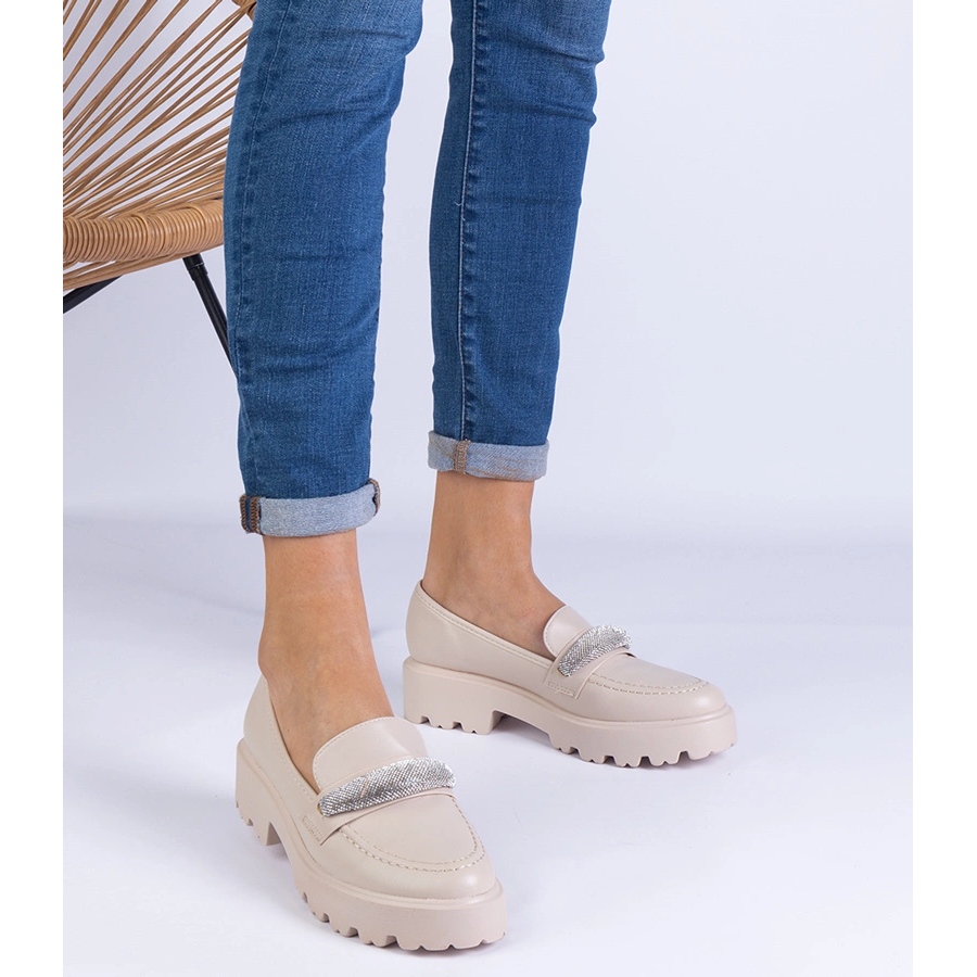 A mokaszinokat egy finom bézs színű különbözteti meg, amely harmonikusan illeszkedik a különféle stilizációkhoz. A legmagasabb minőségű anyagoknak köszönhetően, amelyekből készültek, garantálják a tartósságot és a kényelmet a teljes napos kopás során. A lenyűgöző strasszok ragyognak és eleganciát adnak számukra, és így néznek ki.