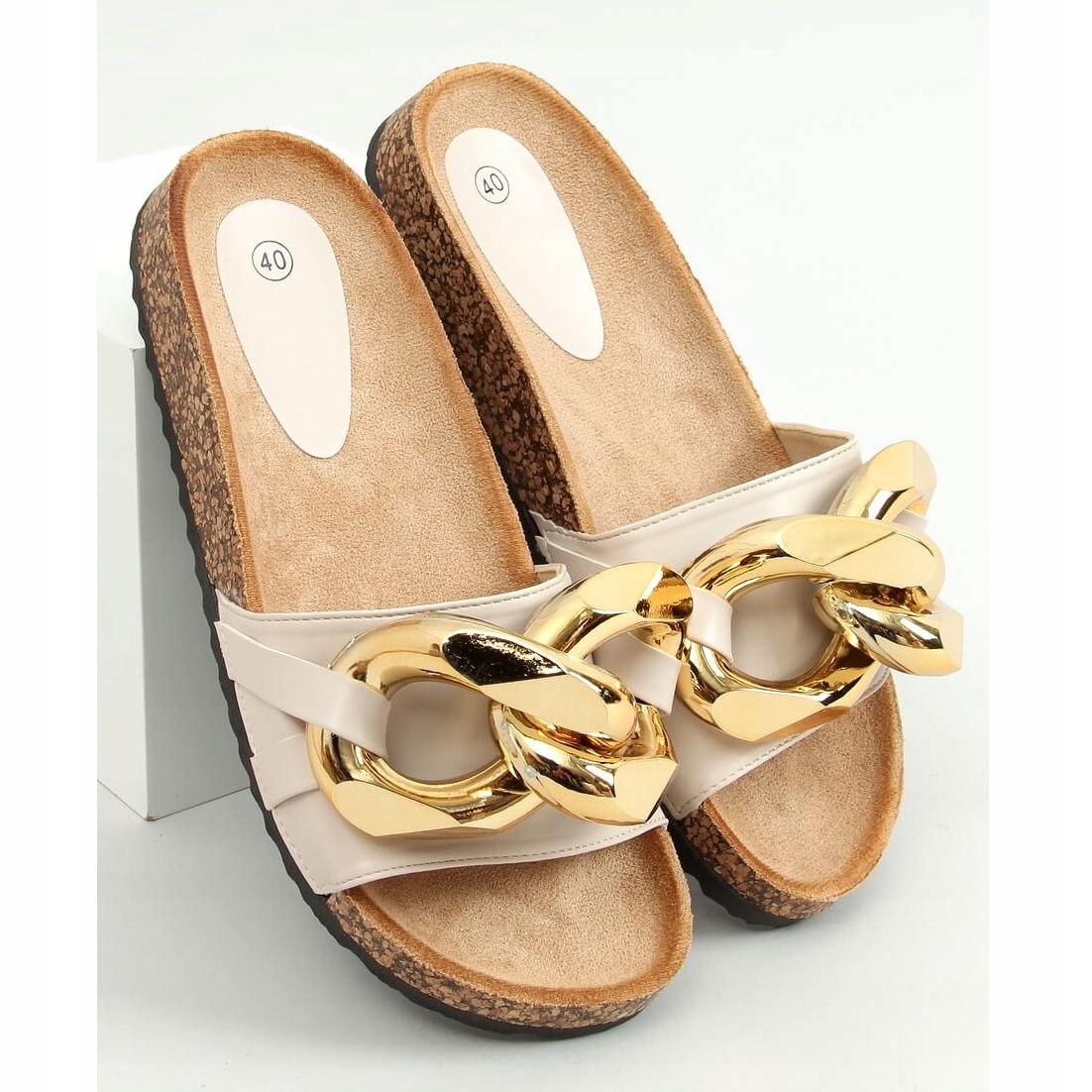 Fedezze fel az eleganciát a mindennapi stílusban a bézs CK201 papucsokkal! Ezek a rendkívül stílusos, parafa talpú női papucsok minden alkalomra tökéletes választás. Jellegzetes aranyláncuk minden tekintetet magára vonz, így egyedinek és divatosnak érzi magát.