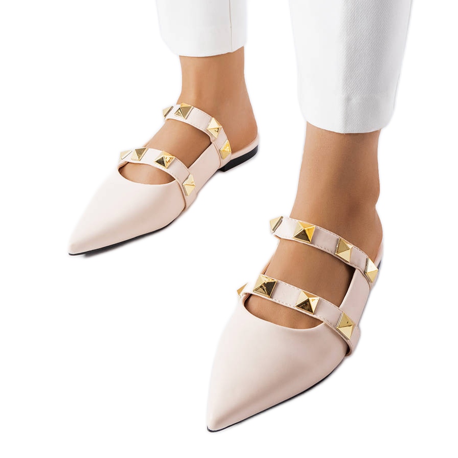 Bézs flip flops ruckman - modern, minimalista és karakterrel. Csúsztatva, az elülső és az oldalra épített, a sarok és a metatarsus kivágásaival. Lapos sarkú (kb. 2 cm), két csíkkal díszítve, csapokkal díszítve - tökéletes, ha szereti a szokatlan kiegészítőket a mindennapi stílusban.