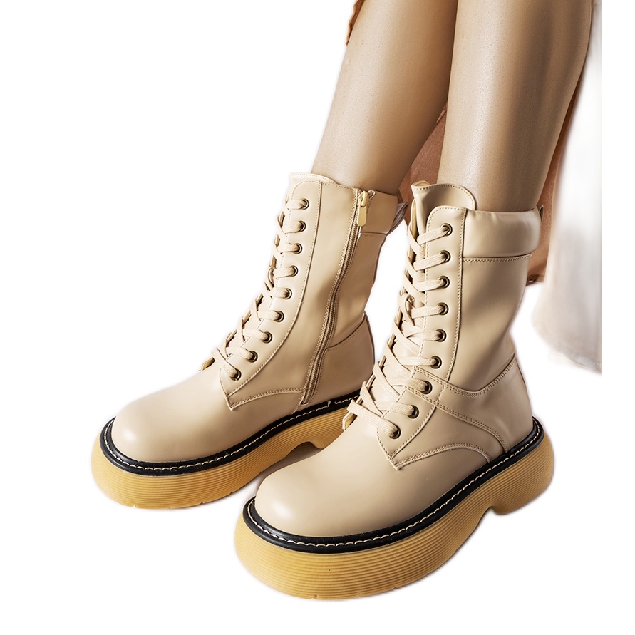 A stílusos, bézs davi munkavállalók divatos megjelenés és gyakorlati felmelegedés kombinációja - tökéletes a hűvösebb napokra. Ökológiai bőrből készült, stabil gumi platformon (kb. 5 cm), kényelmet és modern vágást biztosít a boka felé. A klasszikus, kerek orr és a kötés és a zár, amely megkönnyíti az illesztés és a felhelyezés. A modell az eredeti dobozban kapható, a CE tanúsítvánnyal.