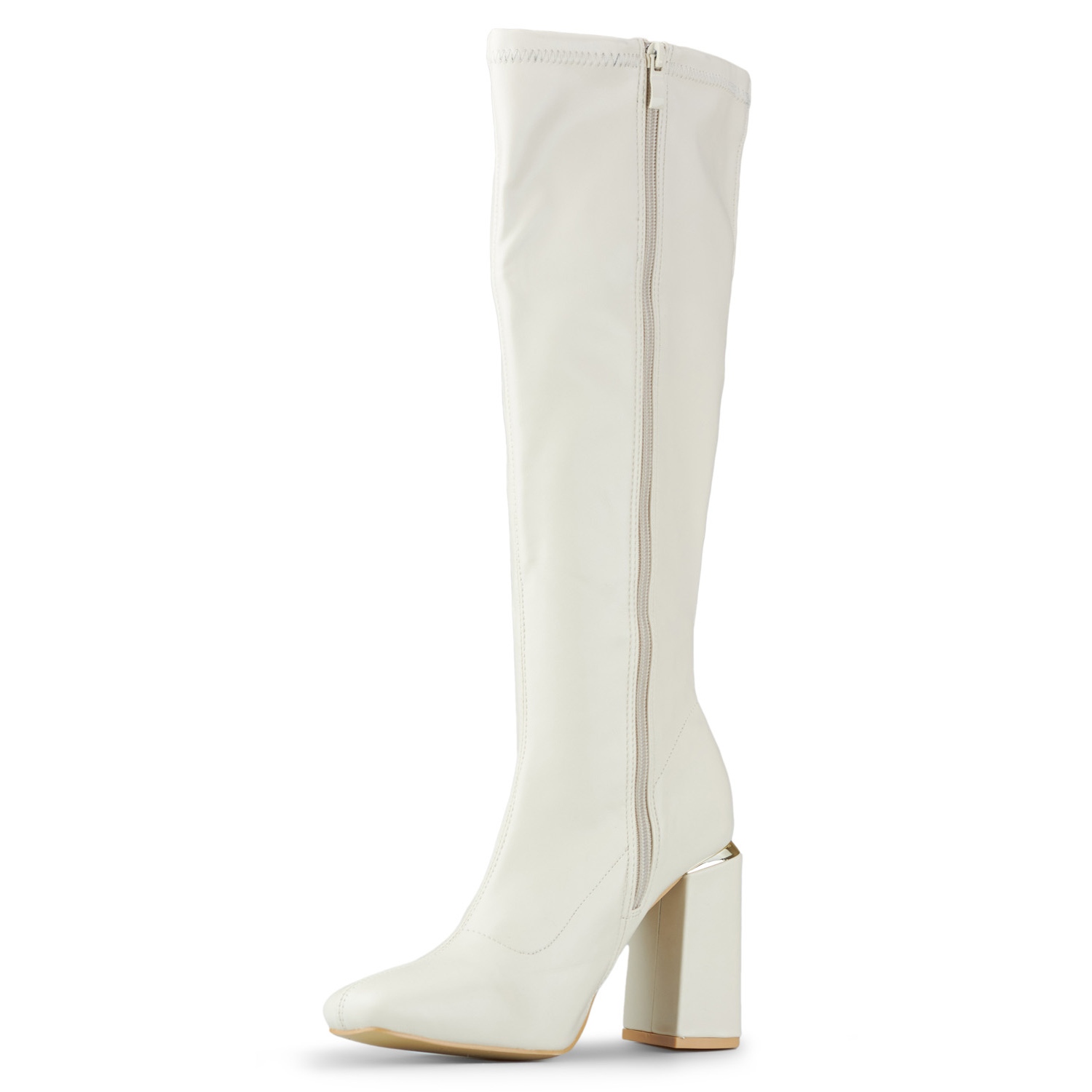 Részletek: Bézs színű, magas sarkú eco-bőr csizma