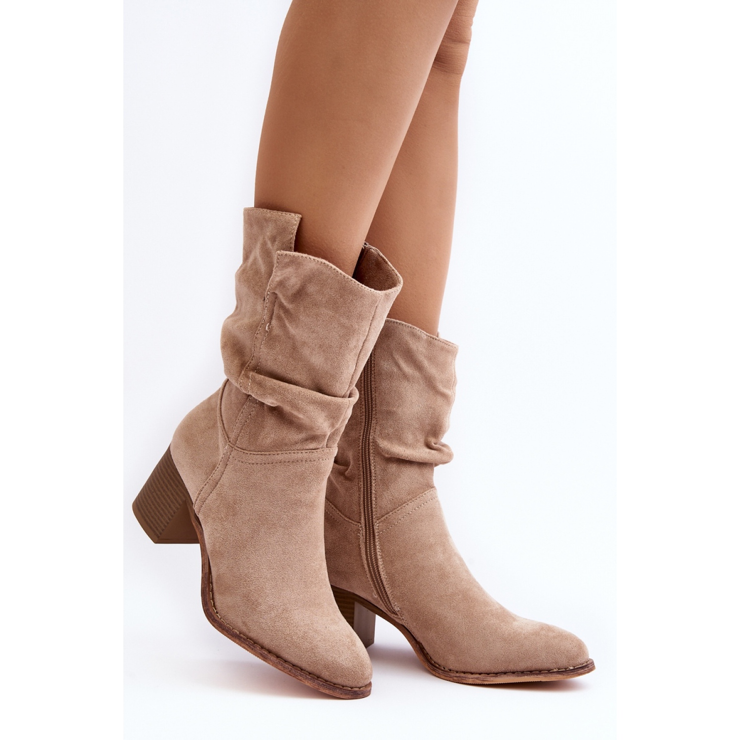 Bemutatjuk a női csizmát, ráncos bézs felső részével, amelyek kiváló választás minden alkalommal. Ezek az elegáns cipők, amelyek kiváló minőségű öko velúrból készülnek, a stílus és a kényelem kombinálása.