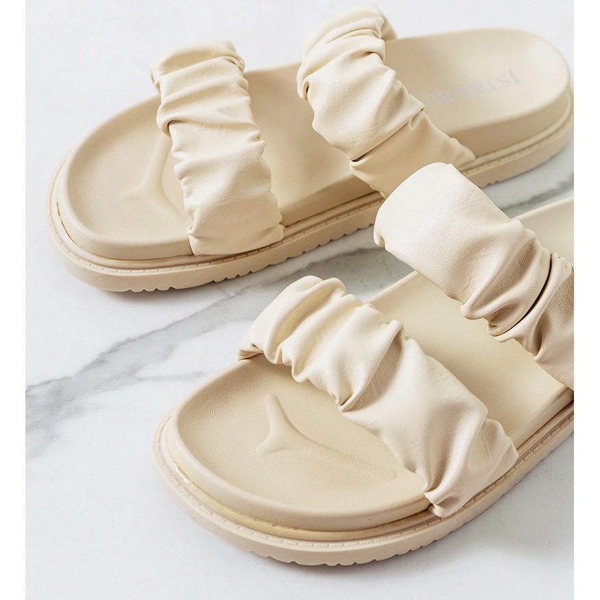 A minimalista, elegáns bézs buzzo papucs minden nap nagyszerű választás. A kiváló minőségű ökológiai bőrből készült ráncos felső, amely hozzáadja a karaktert, és illeszkedik az aktuális trendekhez, és a gumi talp és a beszúrás egész nap kényelmet nyújt. A 2,5 cm -es platformon lévő papucsok optikailag meghosszabbítják az ábrát, megőrizve a használat stabilitását és kényelmét.