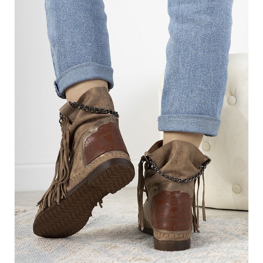 Bemutatjuk a bézs színű női Maral bokacsizmát, mely tökéletesen ötvözi a bohó stílust a mindennapi kényelemmel. A kiváló minőségű ökológiai velúr bőrből készült bokacsizma könnyedségével és eleganciájával gyönyörködik. Fémes lánccal és divatos rojtokkal díszítve tökéletesen kiegészítik minden őszi-téli stílust, kifinomult karaktert adva hozzá.