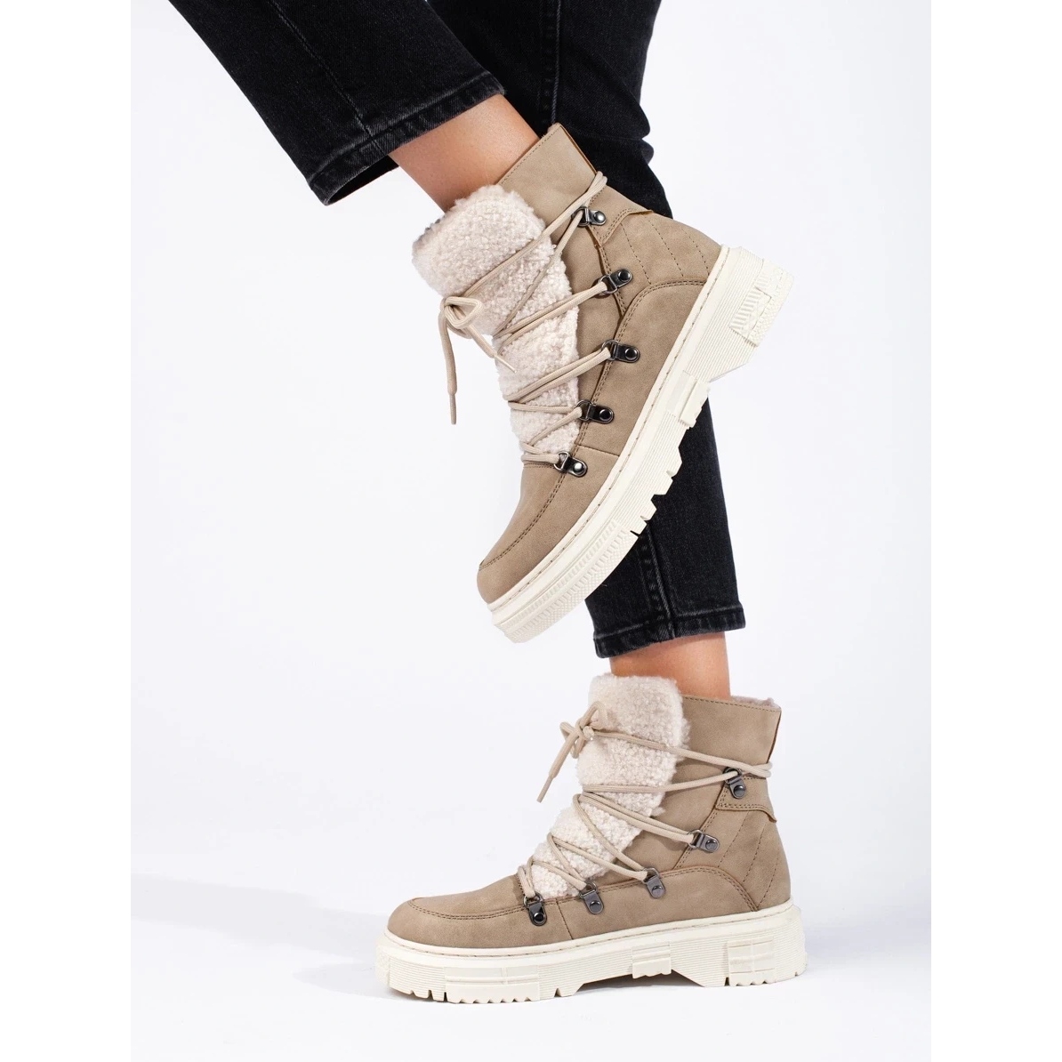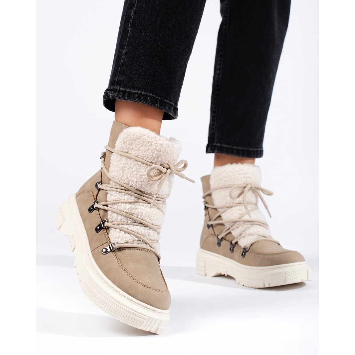 Bézs hócsizmák, báránybőr kabáttal, kombinálják a kényelmet és a divatos megjelenést. A puha, szigetelt betét és a textil belső tér garantálja a hőt és a kényelmet alacsony hőmérsékleten. Az ökológiai bőr felső része könnyen karbantartható és ellenáll a szennyeződésnek, és egy épített, merevített fester stabilizálja a lábát sétáláskor. A csipke -UP lehetővé teszi a felső szélességének beállítását az Ön igényeihez. A szilárd talp, amelynek tiszta futófelülete javítja a tapadást a csúszós felületeken.